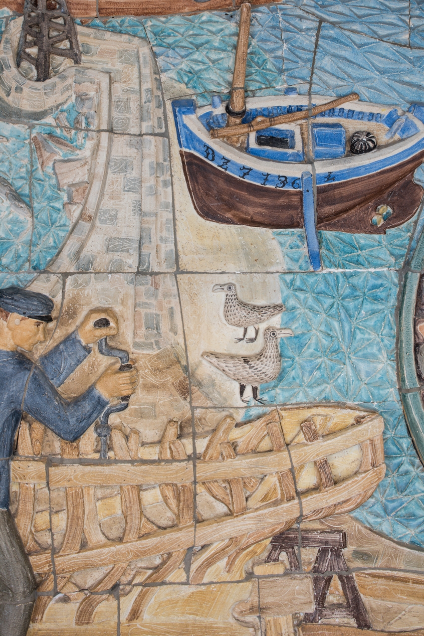Pierre Toulhoat, "Armor", bas-relief en céramique de Quimper (1962). Œuvre du 1% artistique installée dans un foyer de l'internat (bâtiment D) : détail, construction navale.Immatriculation