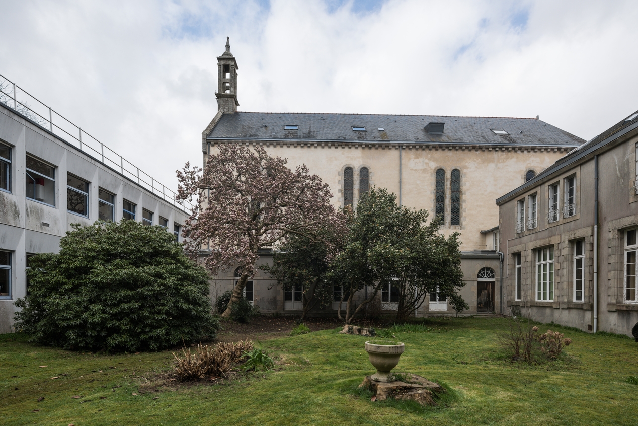 Jardin intérieur de l'ensemble de bâtiments du 19e siècle, vue sur la chapelle. A gauche, le bâtiment construit en 1978, en lieu et place de l'aile ouest.Immatriculation