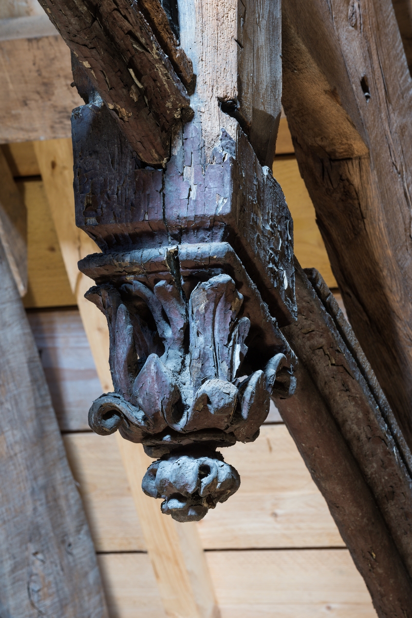 Charpente sculptée de la chapelle (1663) : détail.Immatriculation