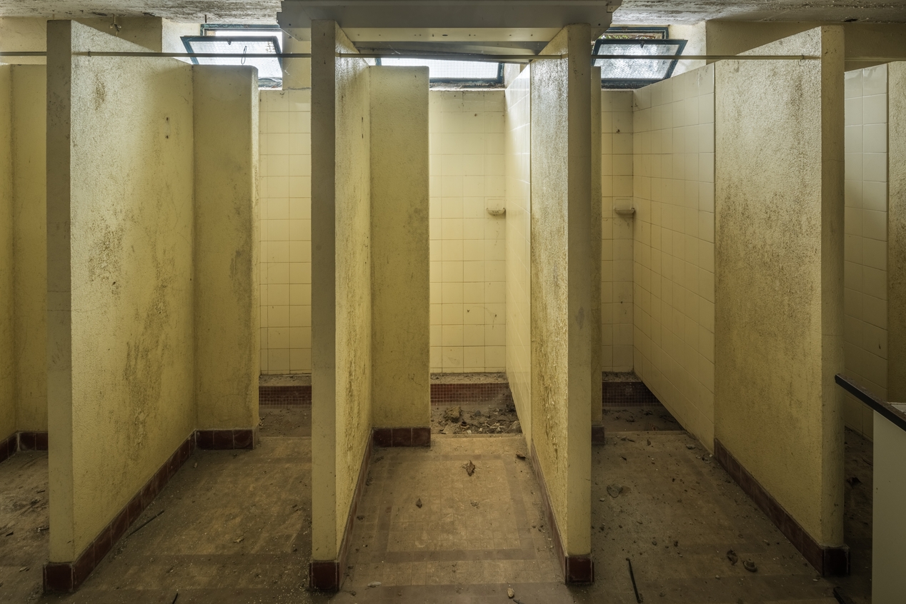 Rangée de douches installée dans le sous-sol lors de la restructuration de l'établissement après la Seconde Guerre mondiale.Immatriculation