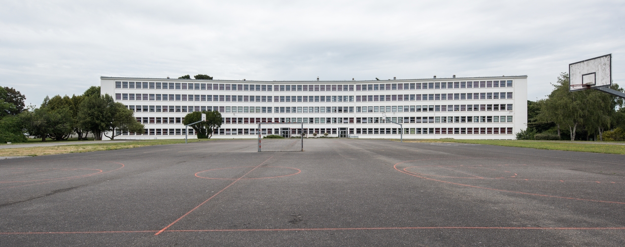 Externat, vue d'ensemble de la façade sud. Noter le plan original de cette "barre", en V, très légèrement évasé (Henri Riedberger, architecte, 1961). Au premier plan, le très grand plateau sportif.Immatriculation