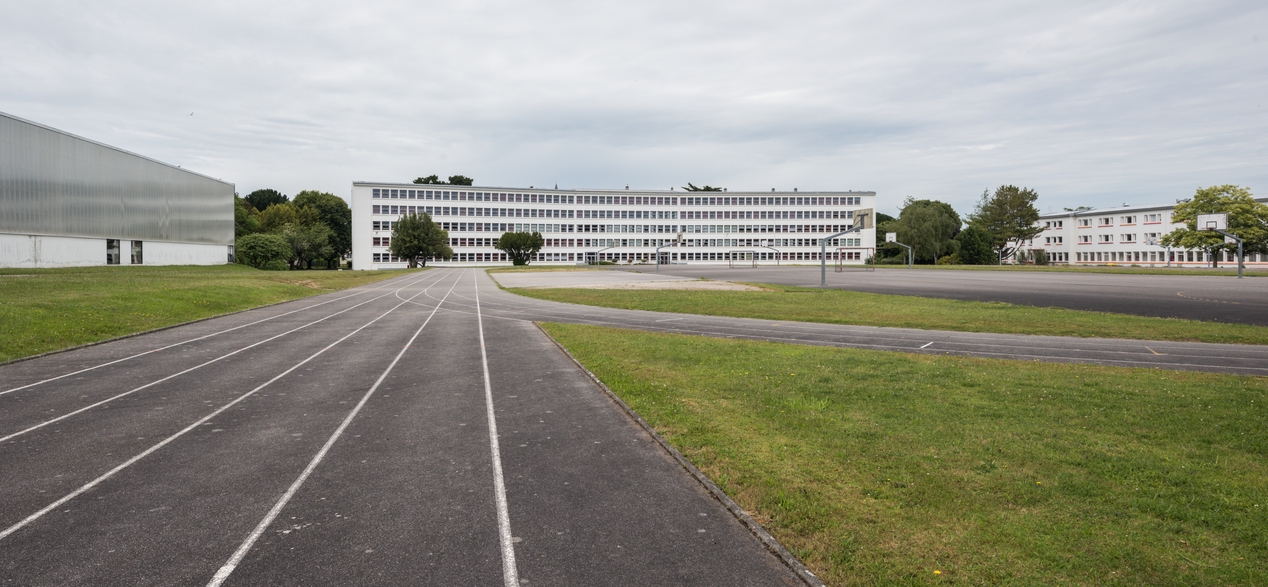 Vue d'ensemble : gymnase (façade est), externat (façade sud), internat des filles (façade ouest) et plateau sportif.Immatriculation