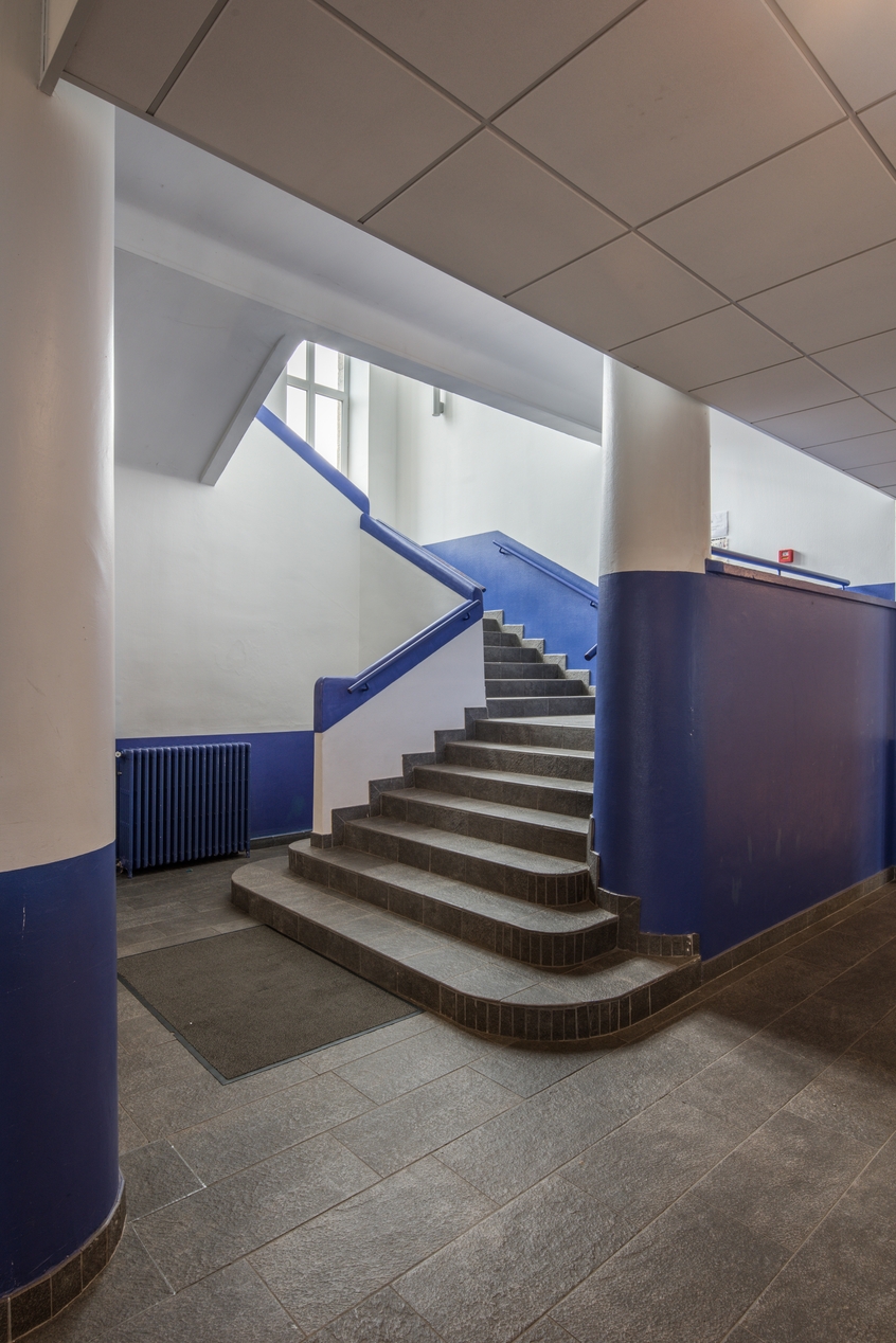 Externat : cage d'escalier centrale, située dans l'avant-corps de la façade nord. Henri Riedberger, architecte, 1961.Immatriculation