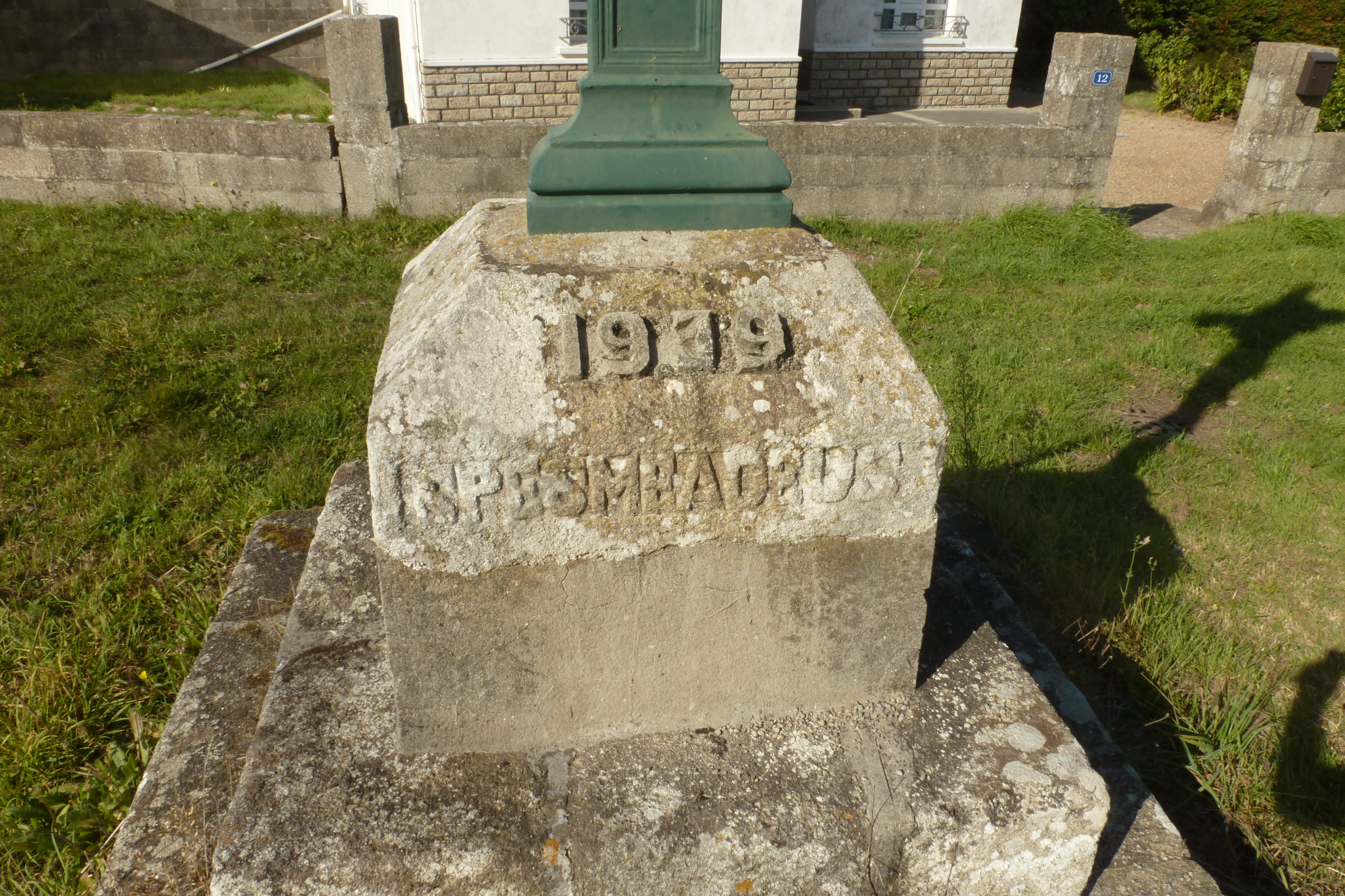 Croix de mission dite "de Kerlavenan". Détail du soubassement et inscription : 1939 SPES MEA DEUSImmatriculation