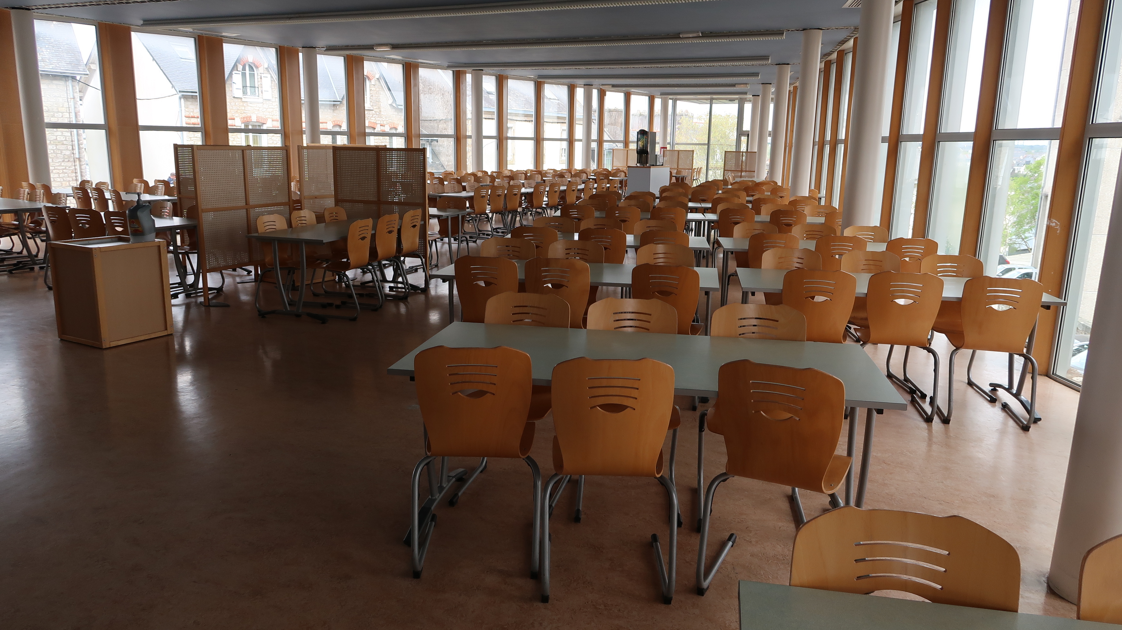 Nouveau service de restauration, G. Chateau et M. Grignou, architectes, 2002 : un réfectoire en forme de proue vitrée, au 1er étage.Immatriculation