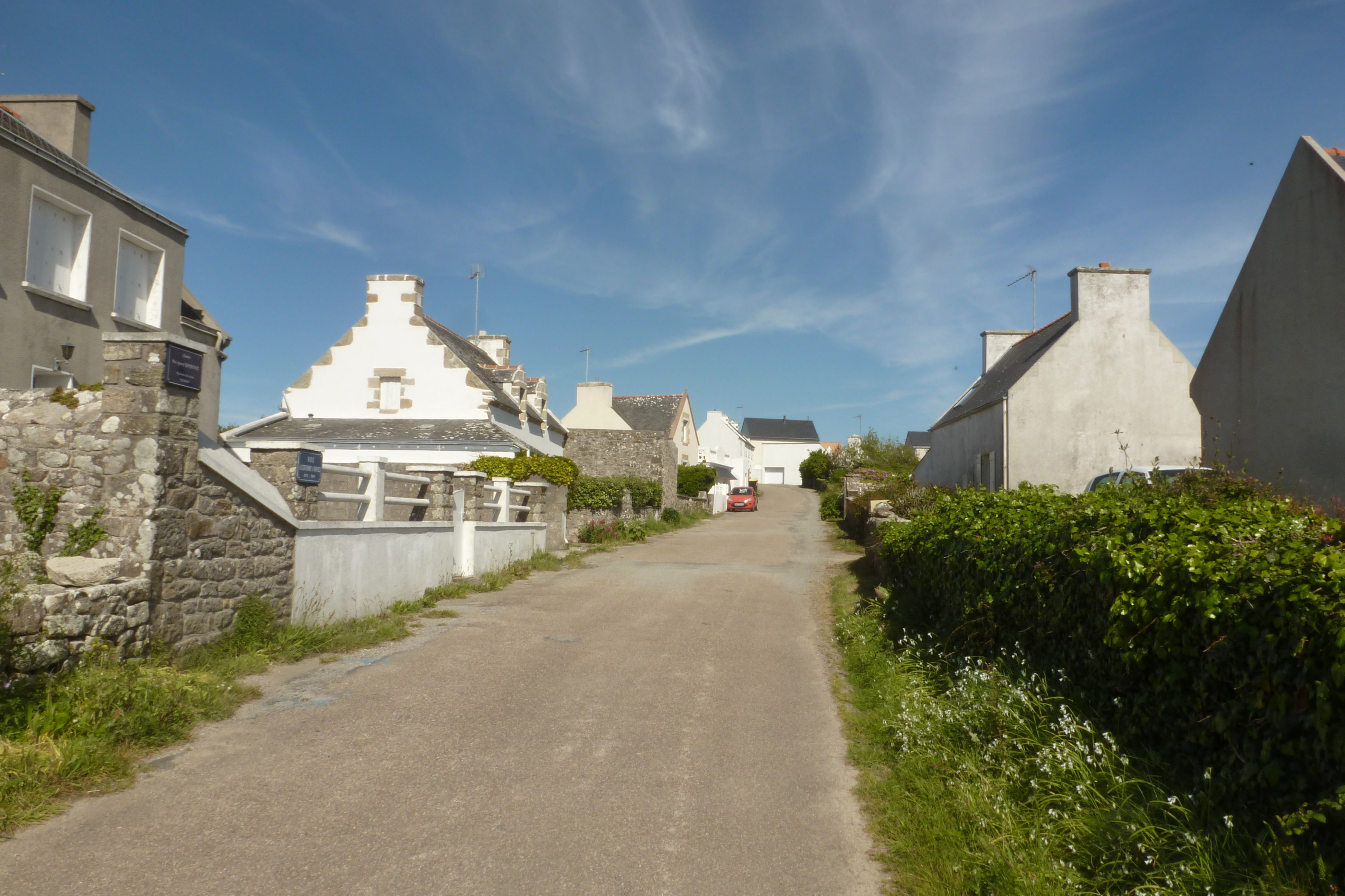Entrée sud-ouest du village en revenant de Pors Loubous. Rue Honnoré d'Estienne d'Orves (autrefois "Ker Gravoz"), vue prise de l'ouest.Immatriculation
