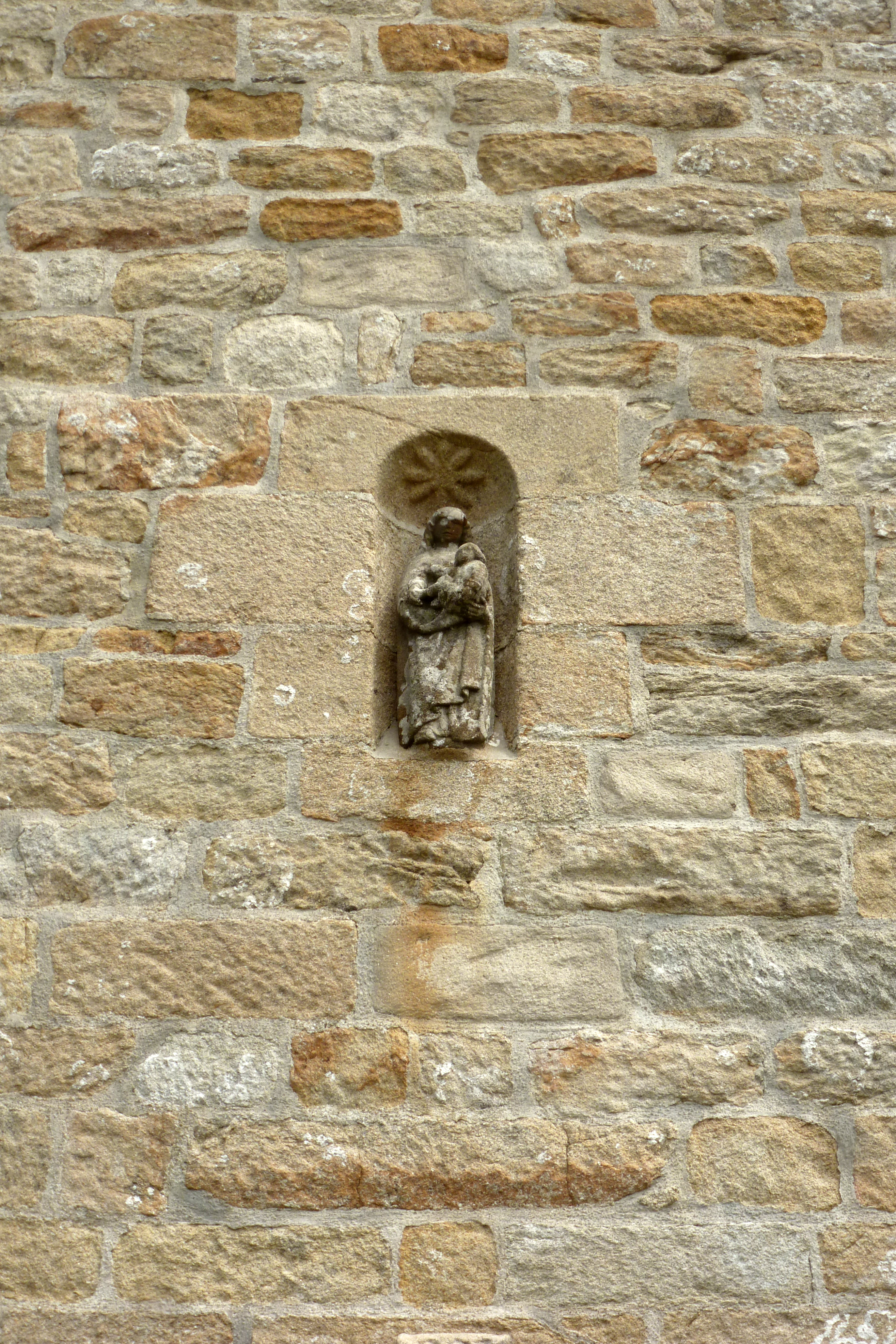Pignon ouest, détail de la niche à saint et statuette de la Vierge à l'Enfant. (2019)Immatriculation