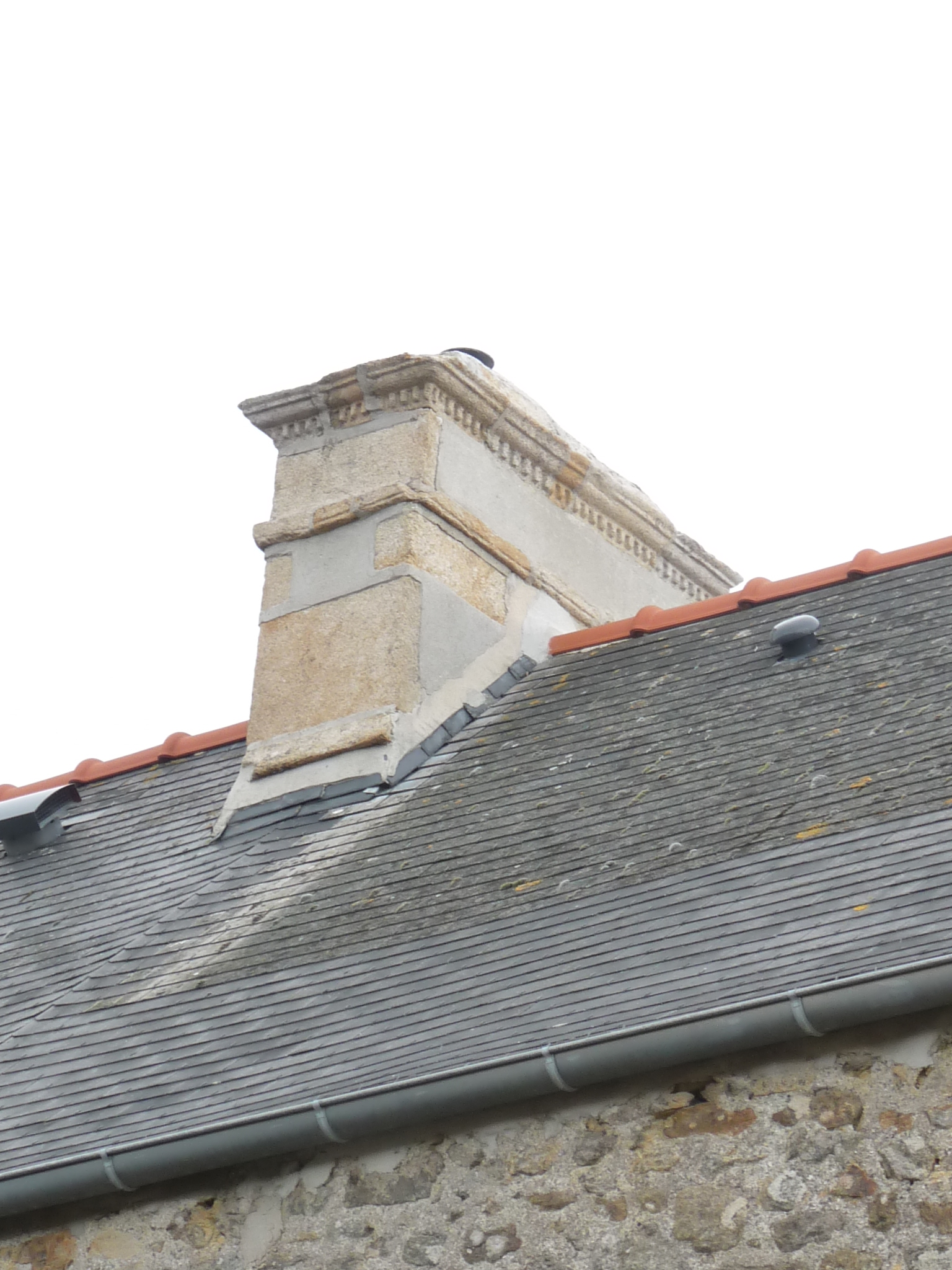 Kerlazen, ferme 1, façade postérieure du logis, détail de la souche de cheminée ouest.Immatriculation