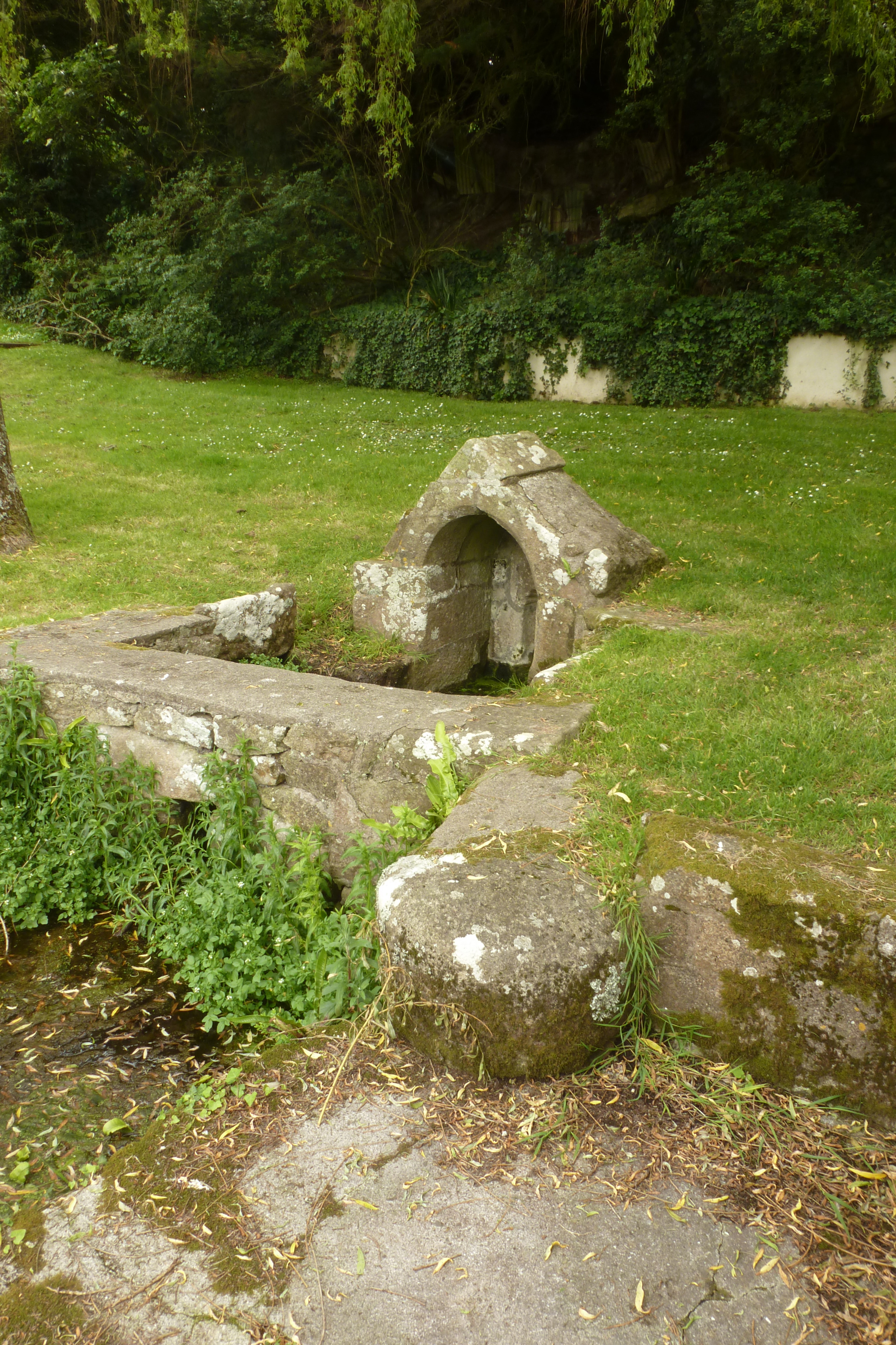 Fontaine Saint-Onneau, bourg d'Esquibien, vue dans son environnement avec stèle de l'âge du fer intégrée au muret en premier plan.Immatriculation