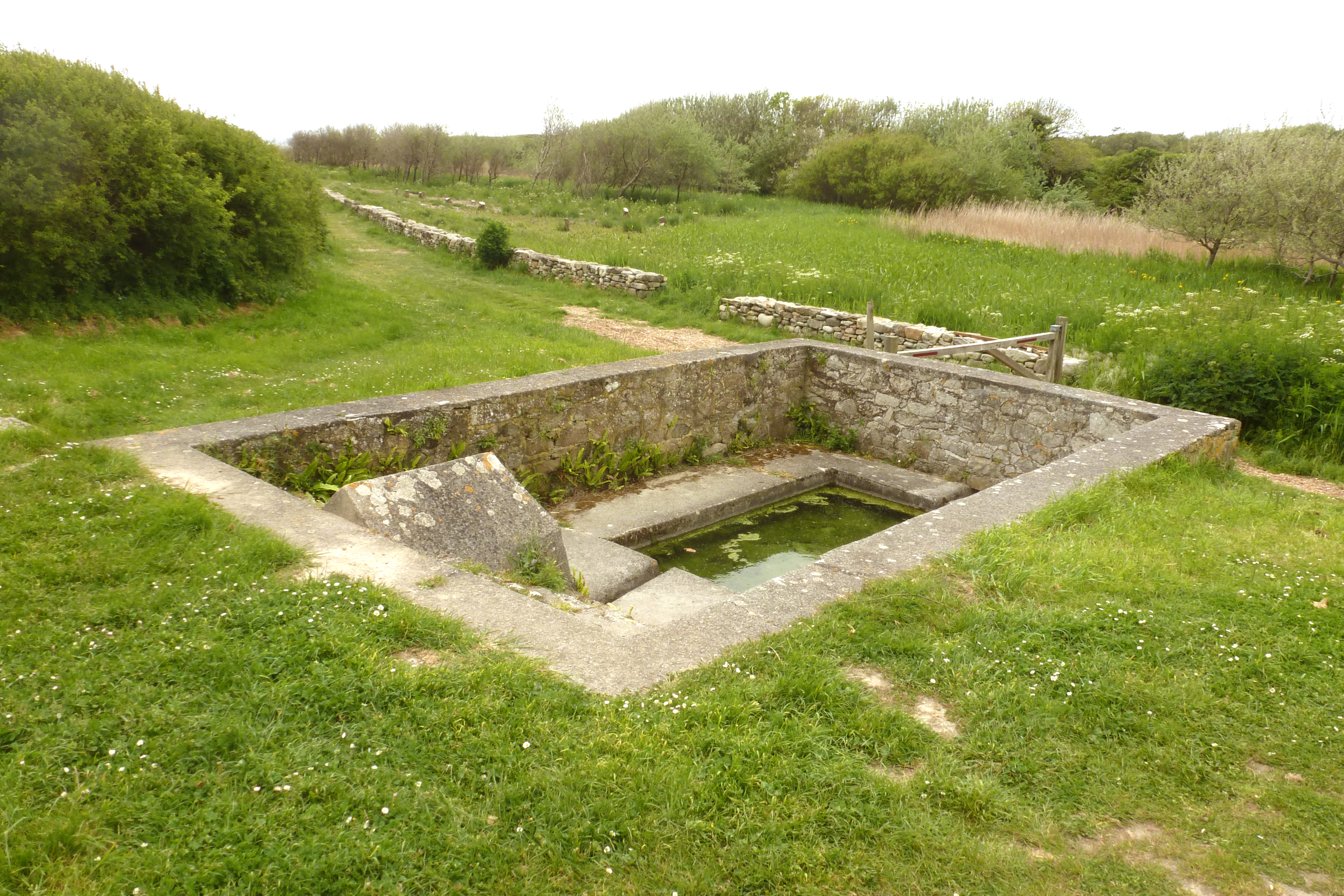 Trez Goarem ouest, ensemble lavoir fontaine daté 1943. Vue prise de l'est.Immatriculation