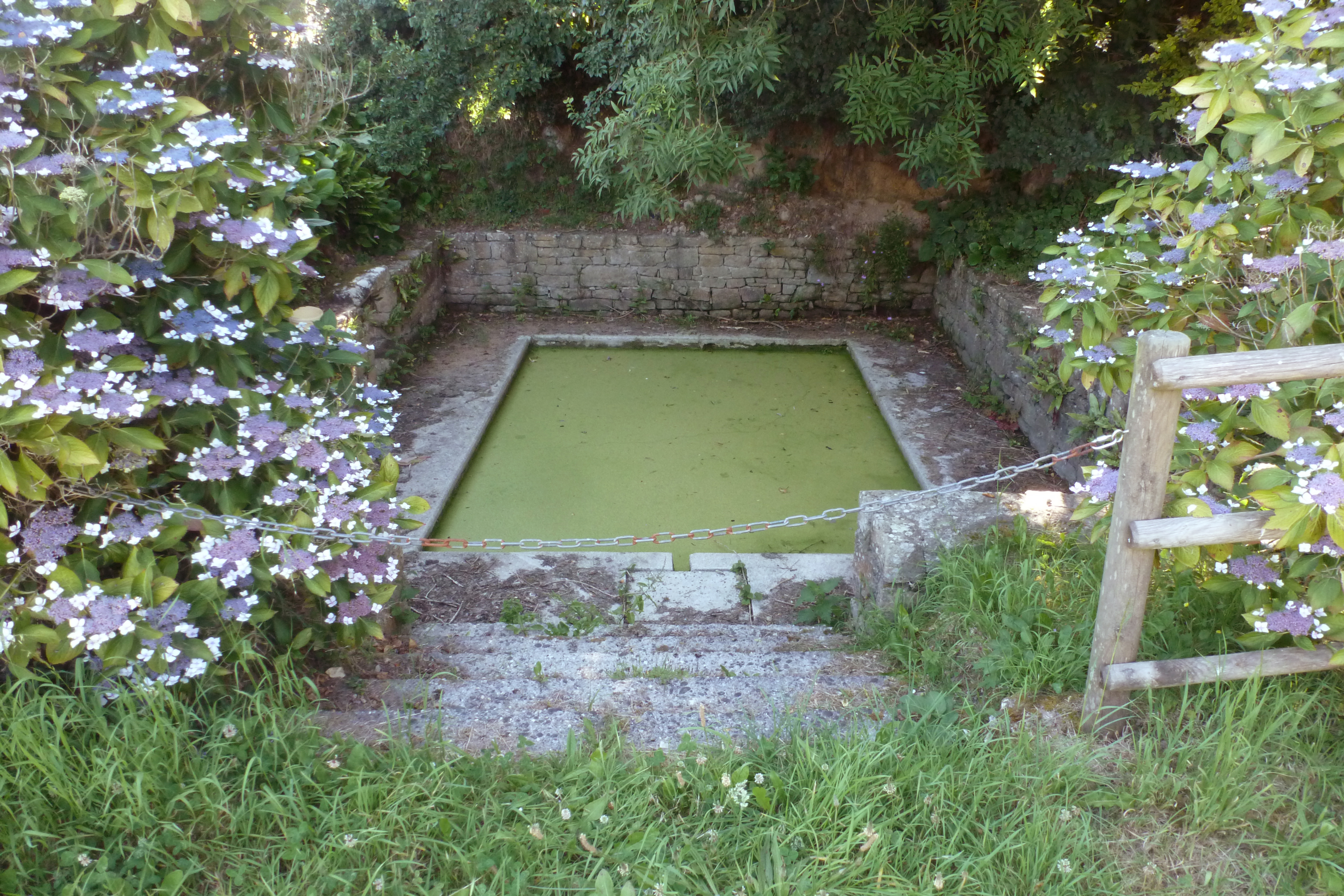 Trévénouen, lavoir situé à quelques mètres à l'est de la fontaine, de l'autre côté du chemin. Vue prise de l'ouest.Immatriculation