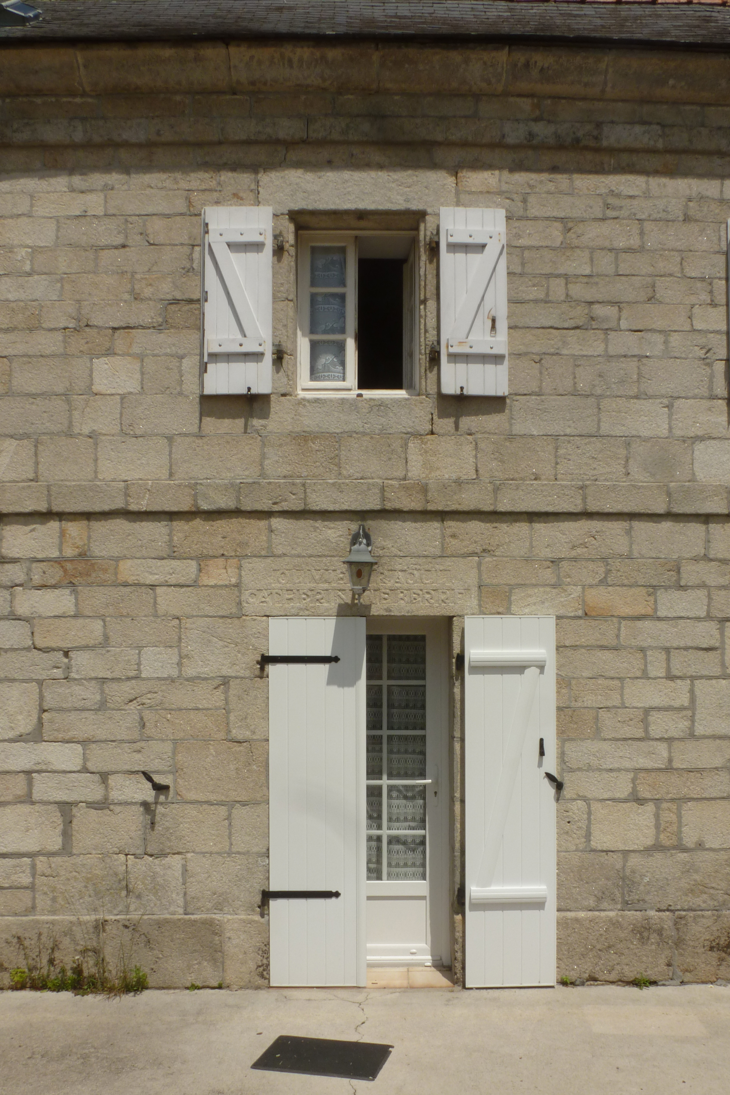 Troloan, ferme 2, détail de la porte d'entrée et inscription : OLIVIER RAOUL / CATHERINE LE BERRE.Immatriculation