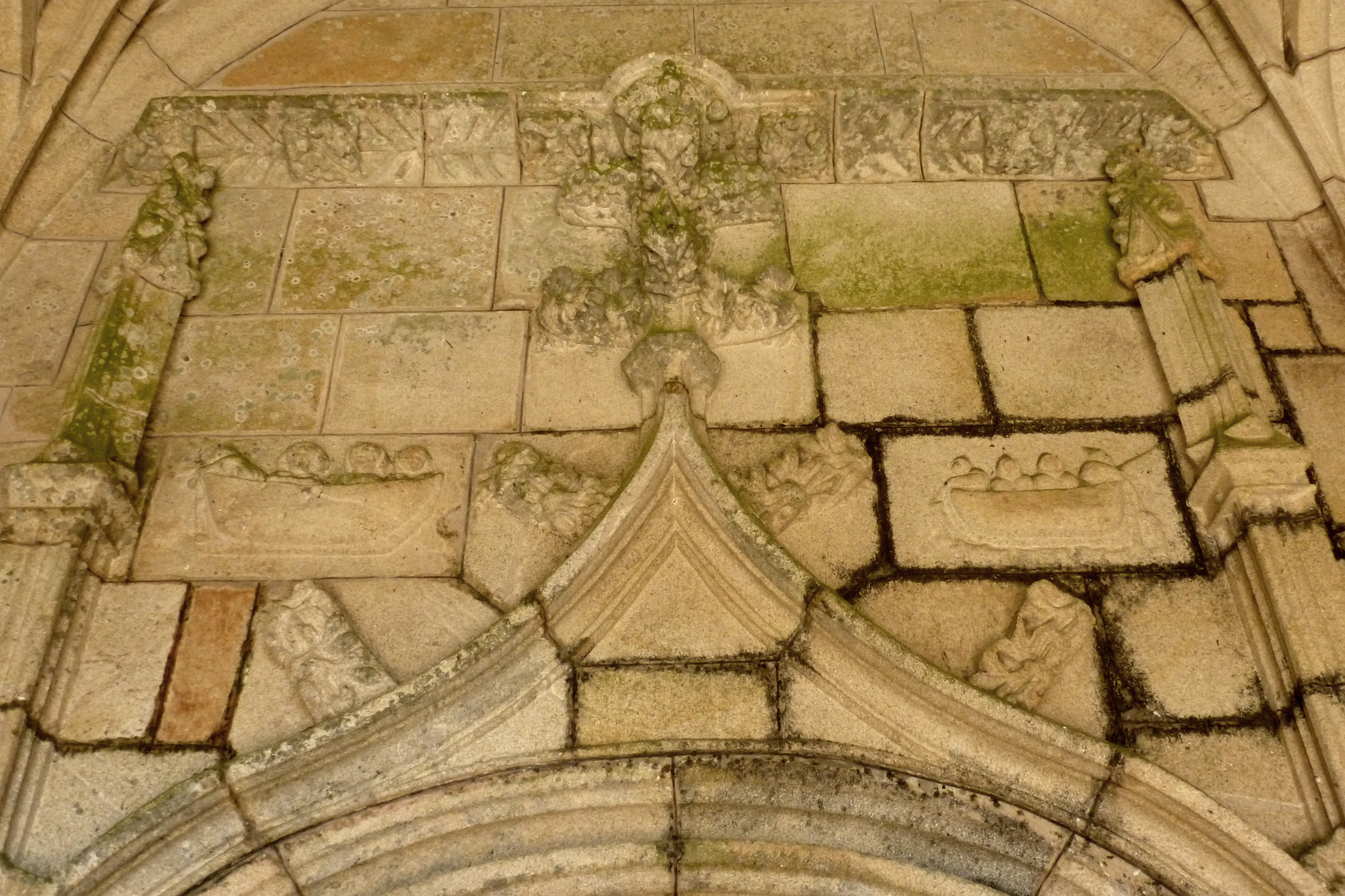 Porche sud, intérieur, détail de deux barques de pêche sculptées. (2019)Immatriculation