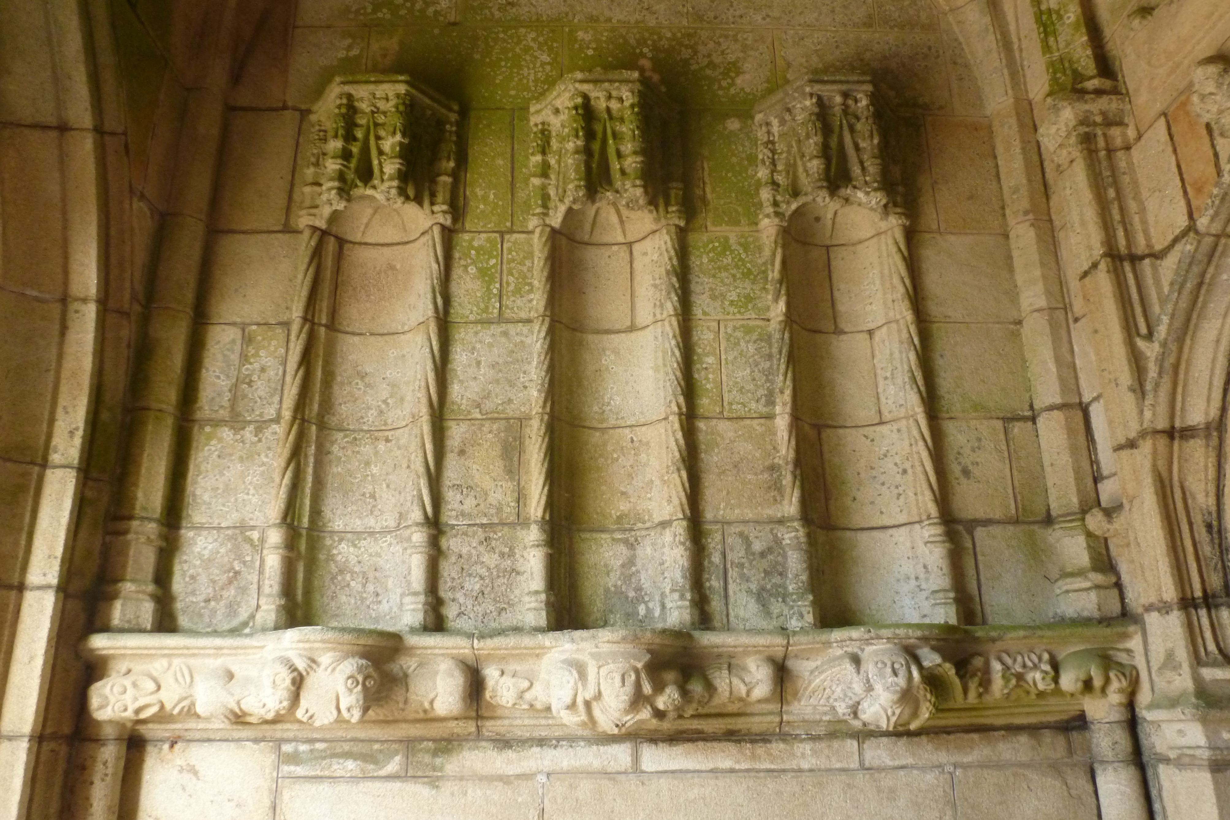 Porche sud, mur intérieur ouest, détail de trois niches et leur soubassement mouluré. (2019)Immatriculation