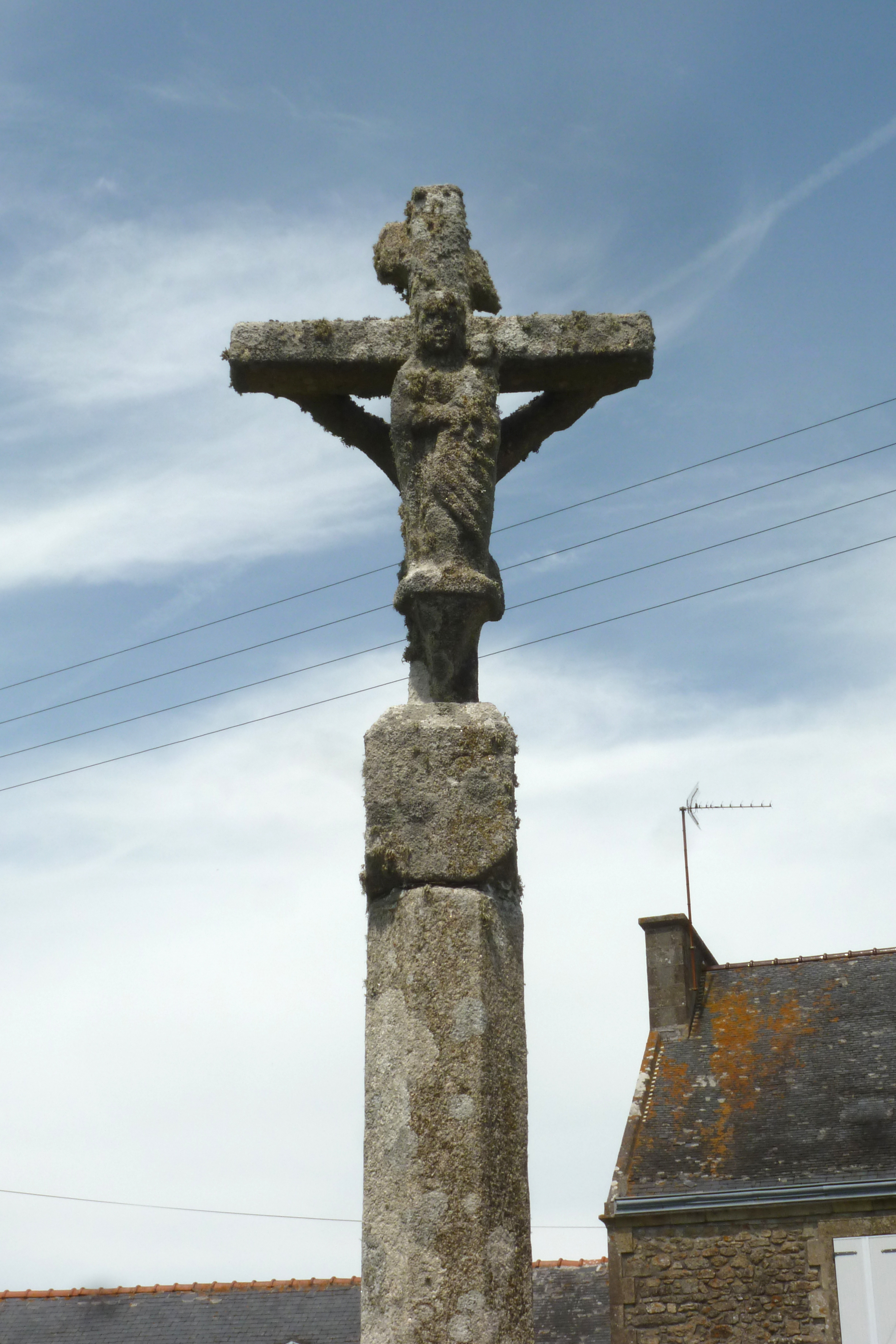 Croix monumentale datée 1869, détail du côté sud du croisillon, Vierge à l'Enfant.Immatriculation