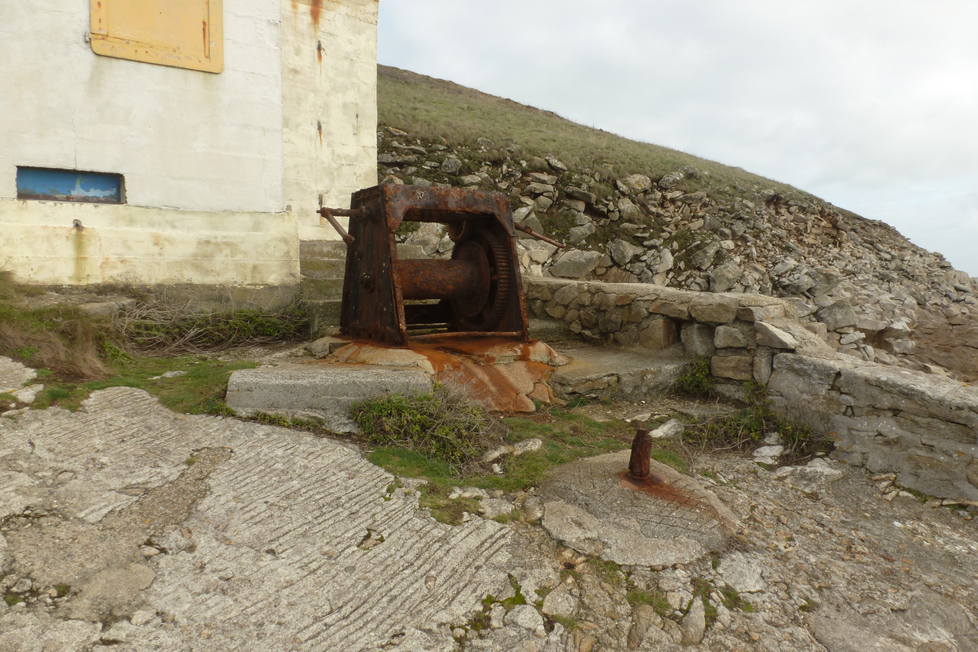 Plateforme, détail de l'ancien treuil de hissage.Immatriculation