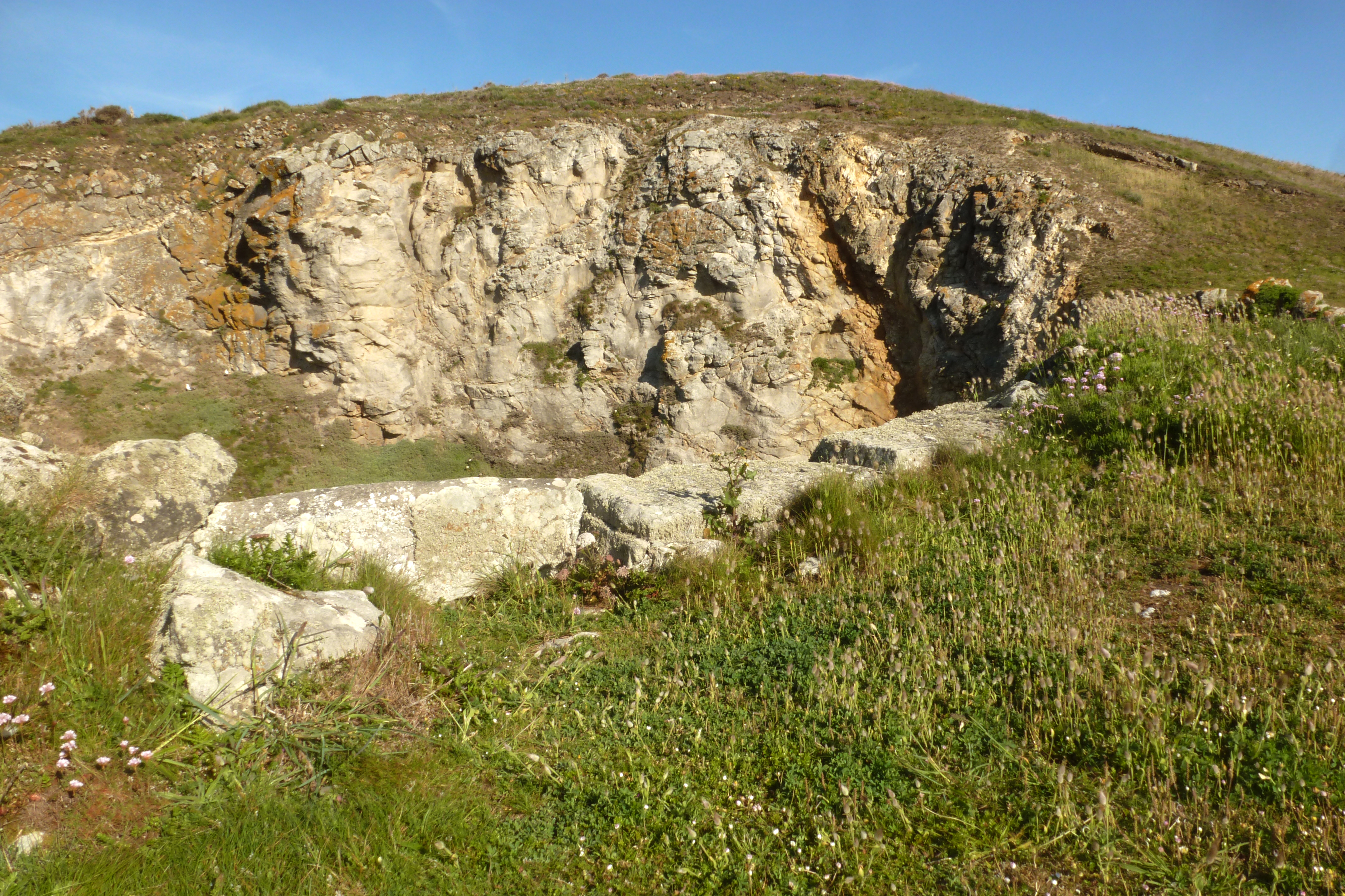 Pointe du Diameur, côté est de la crique dite "Kougon Diameur Braz". Pierres dréssées en bord de falaise pour empecher les algues de retomber.Immatriculation