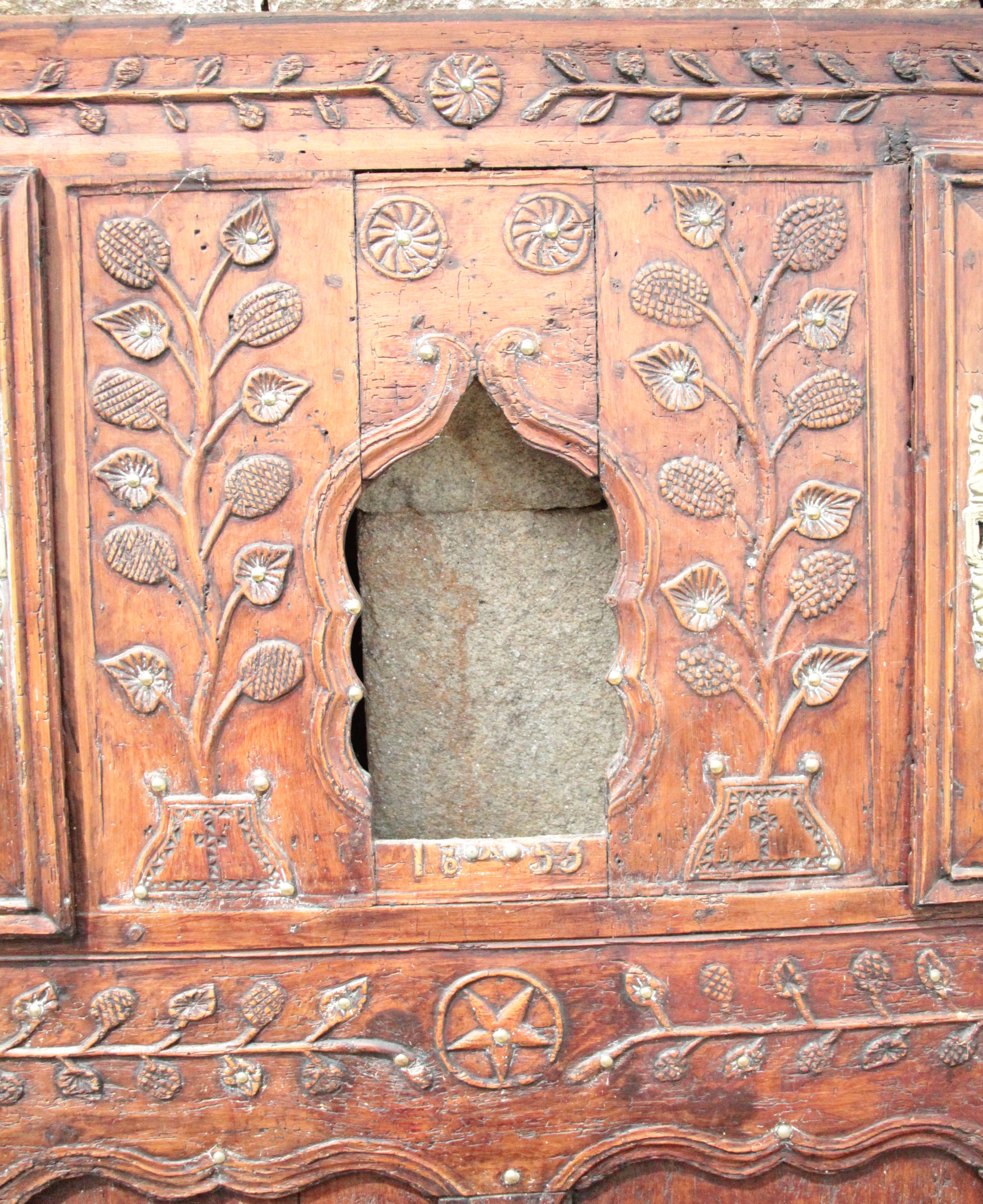 Drustuilh 3 daté 1853, détail de la niche à Vierge et bouquets en place des habituels ostensoirs. (2019)Immatriculation