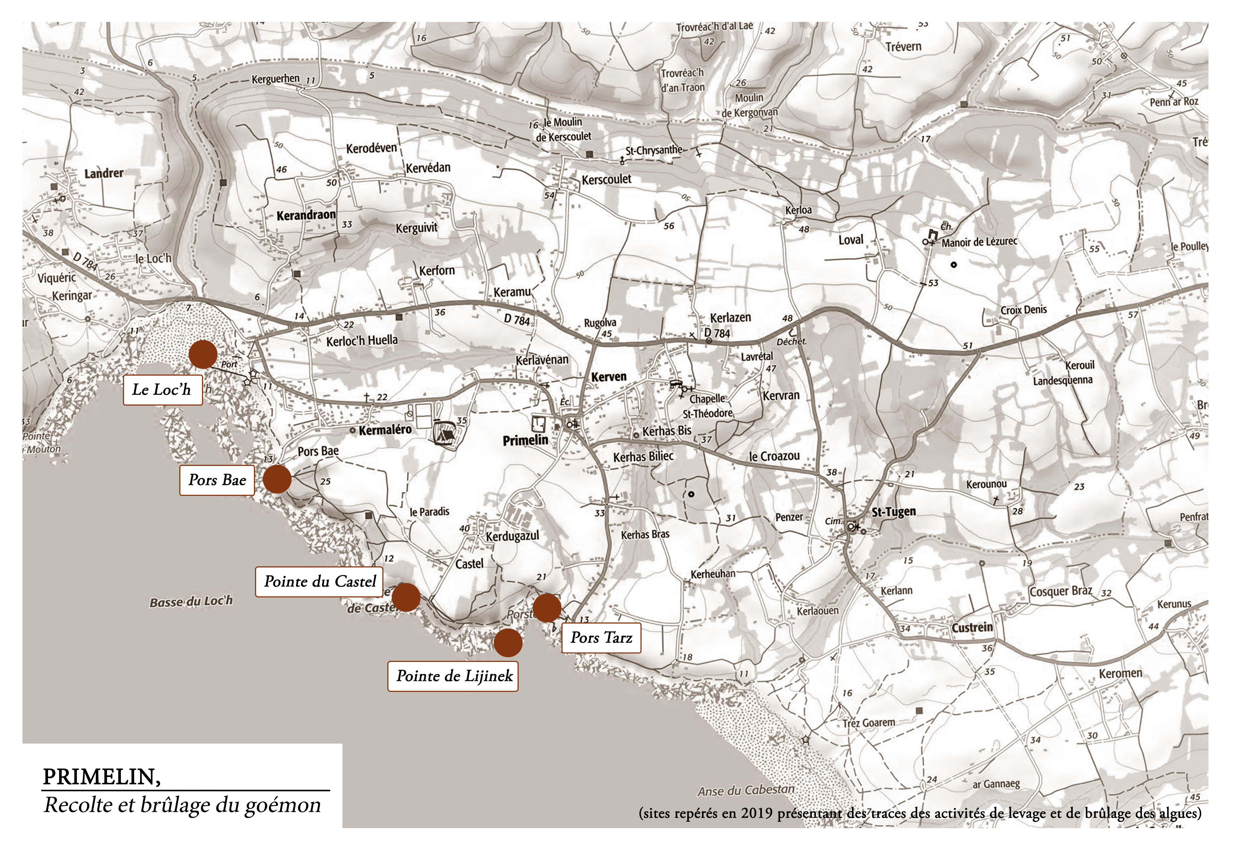 Sites présentant des traces des activités de levage et de brûlage du goémon en 2019 à Primelin. Carte de localisationImmatriculation