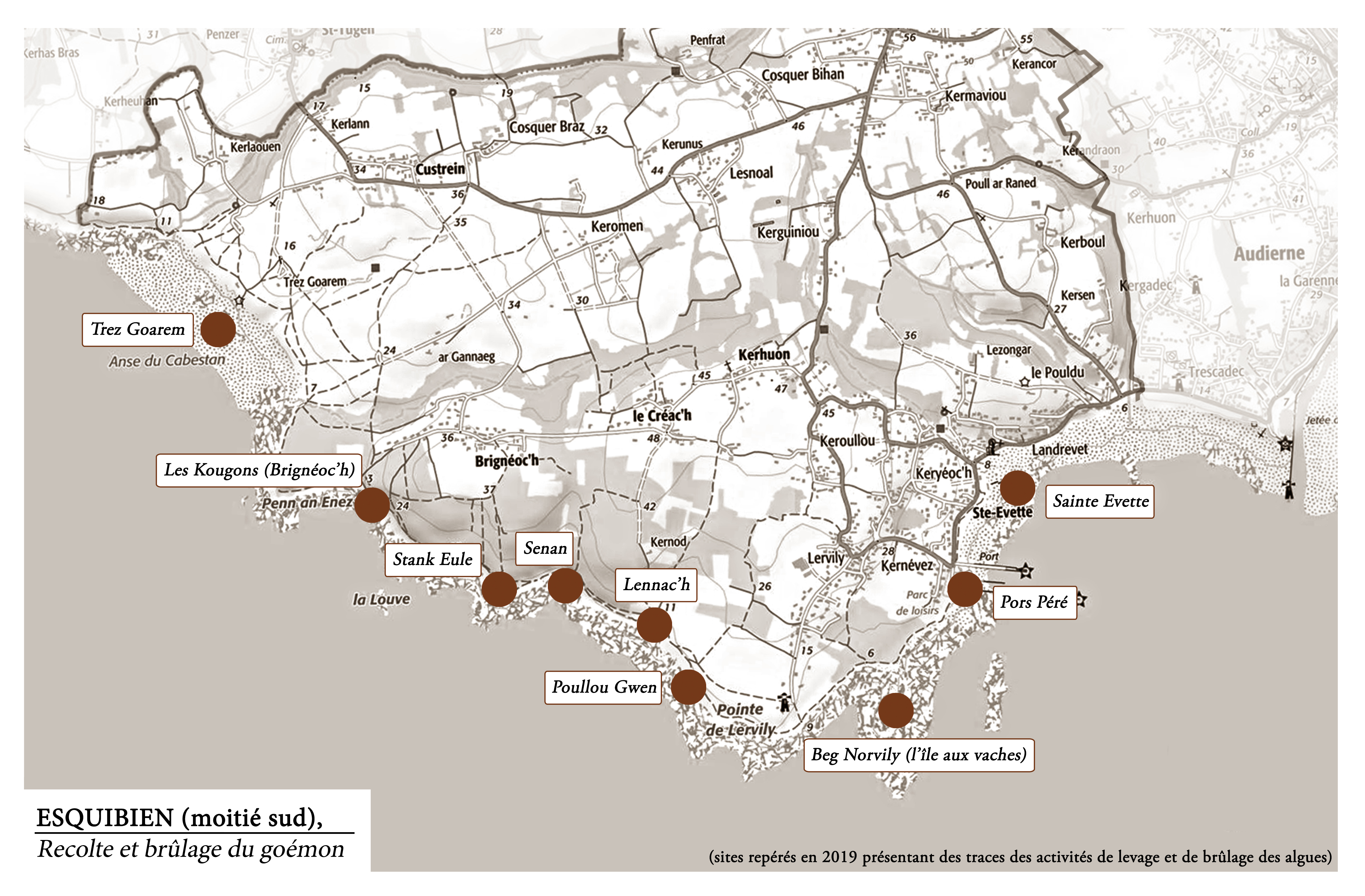 Sites présentant des traces des activités de levage et de brûlage du goémon en 2019 sur la commune historique d'Esquibien. Carte de localisationImmatriculation
