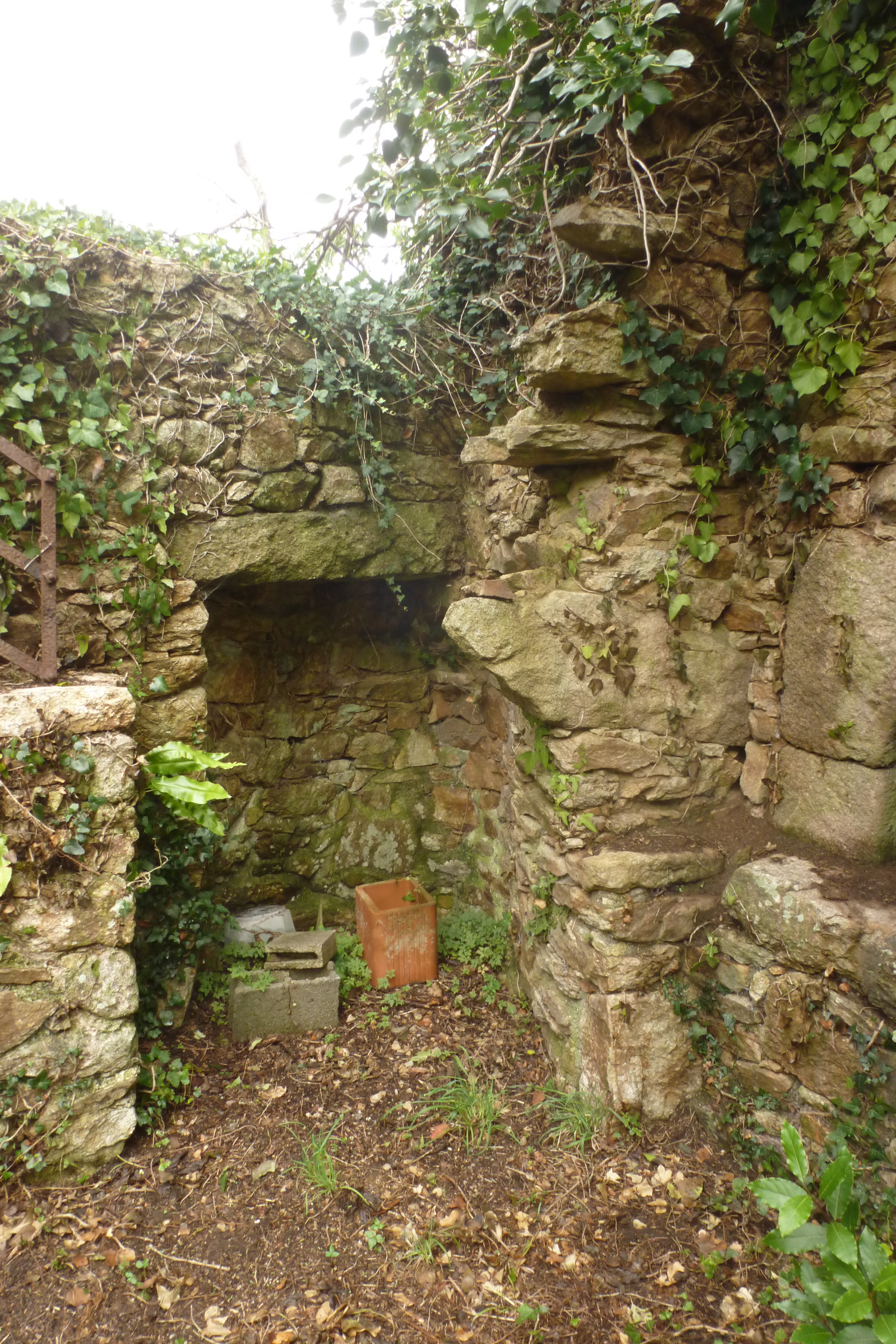 Fournil ruiné isolé au nord du logis, mur nord. Détail du renfoncement circulaire destiné à recevoir une auge à buée. (2019)Immatriculation