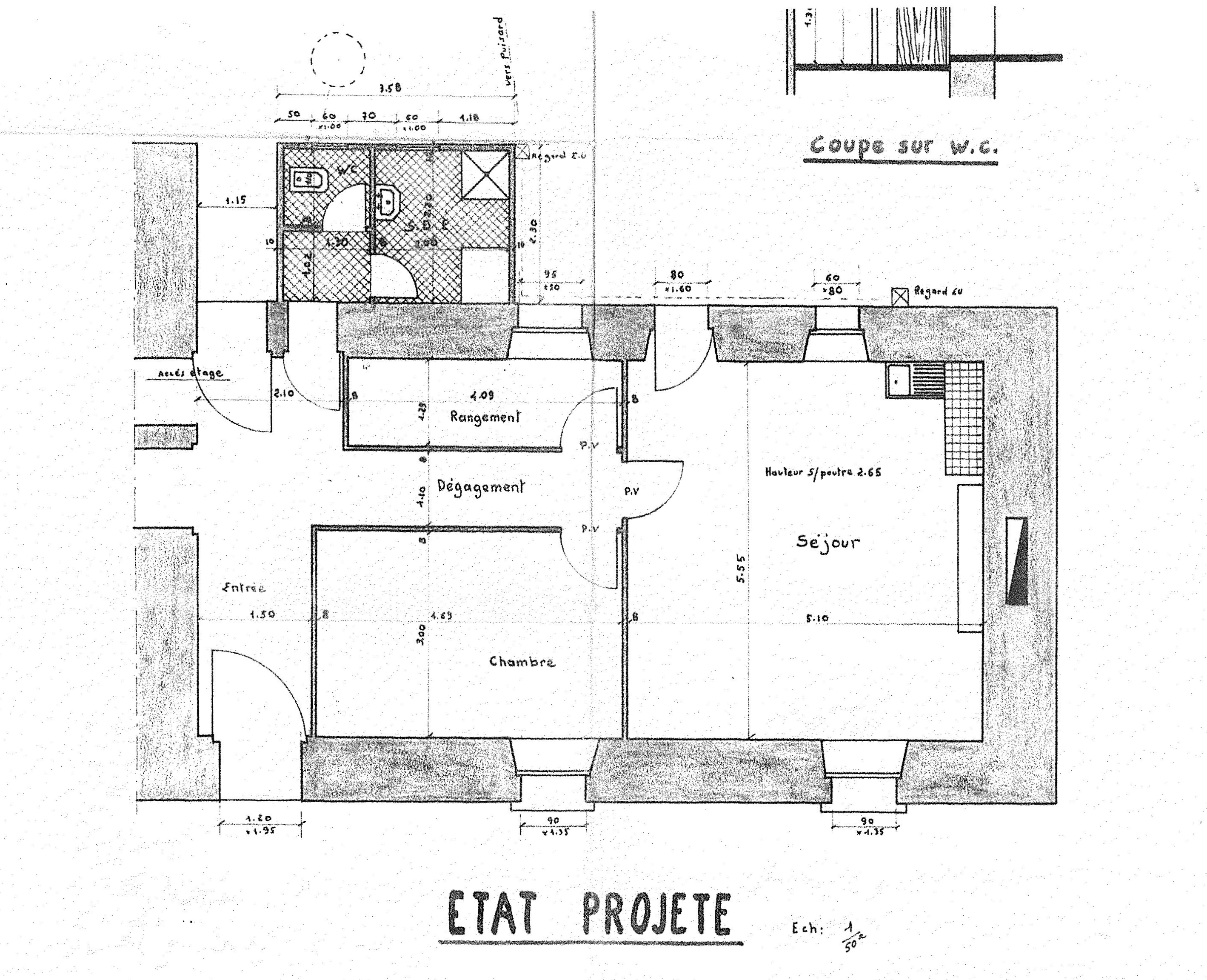 Projet d'amélioration de la maison d'habitation de Jean Jacob, plan du logis de ferme, état projeté (partie orientale de l'ancien logis manorial), vers 1960-1975 (collection particulière)Immatriculation