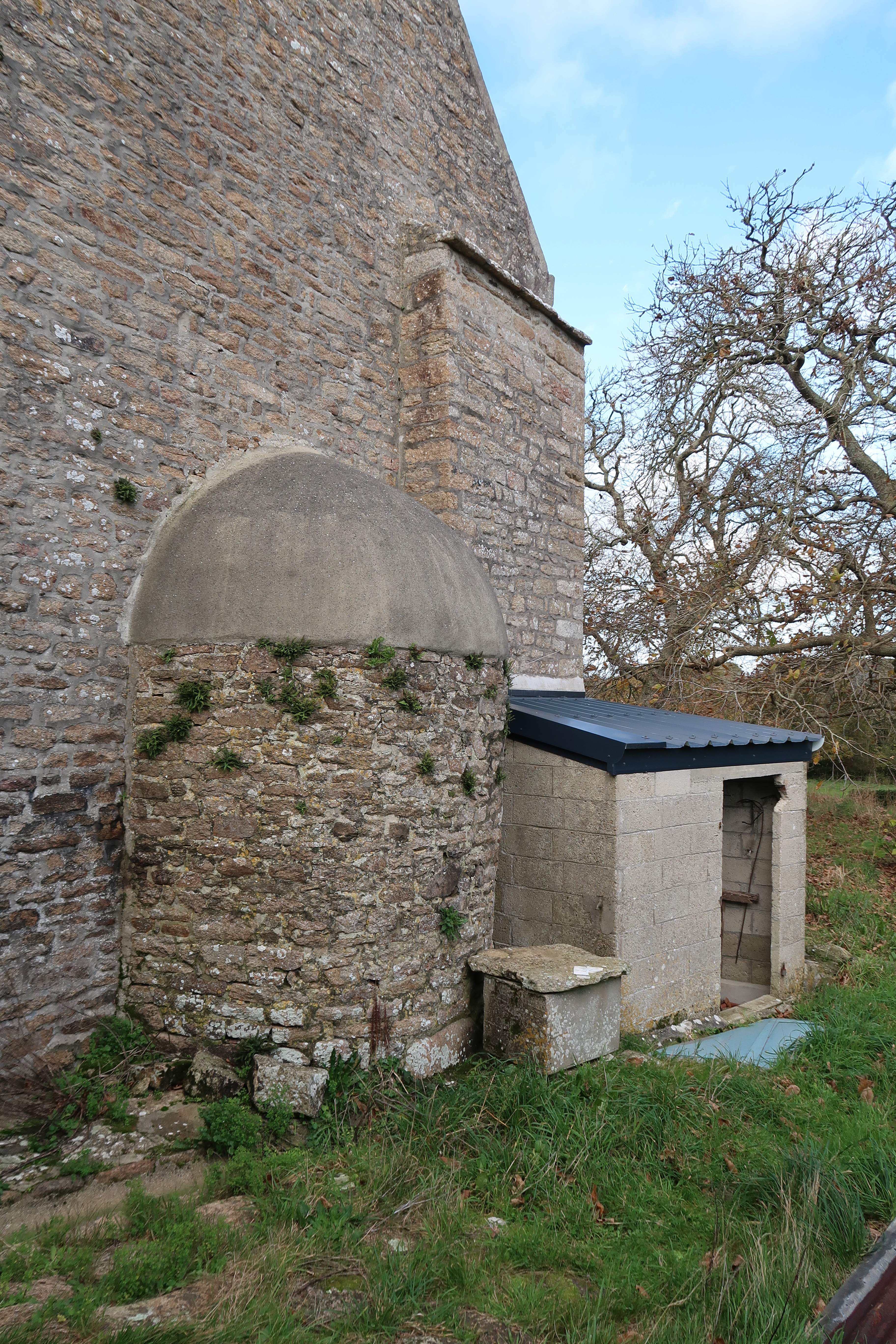 Détail du pignon oriental du logis manorial : four accolé et latrines en légère saillie ; édicule lié à l'ancienne exploitation agricole construit en parpaingImmatriculation