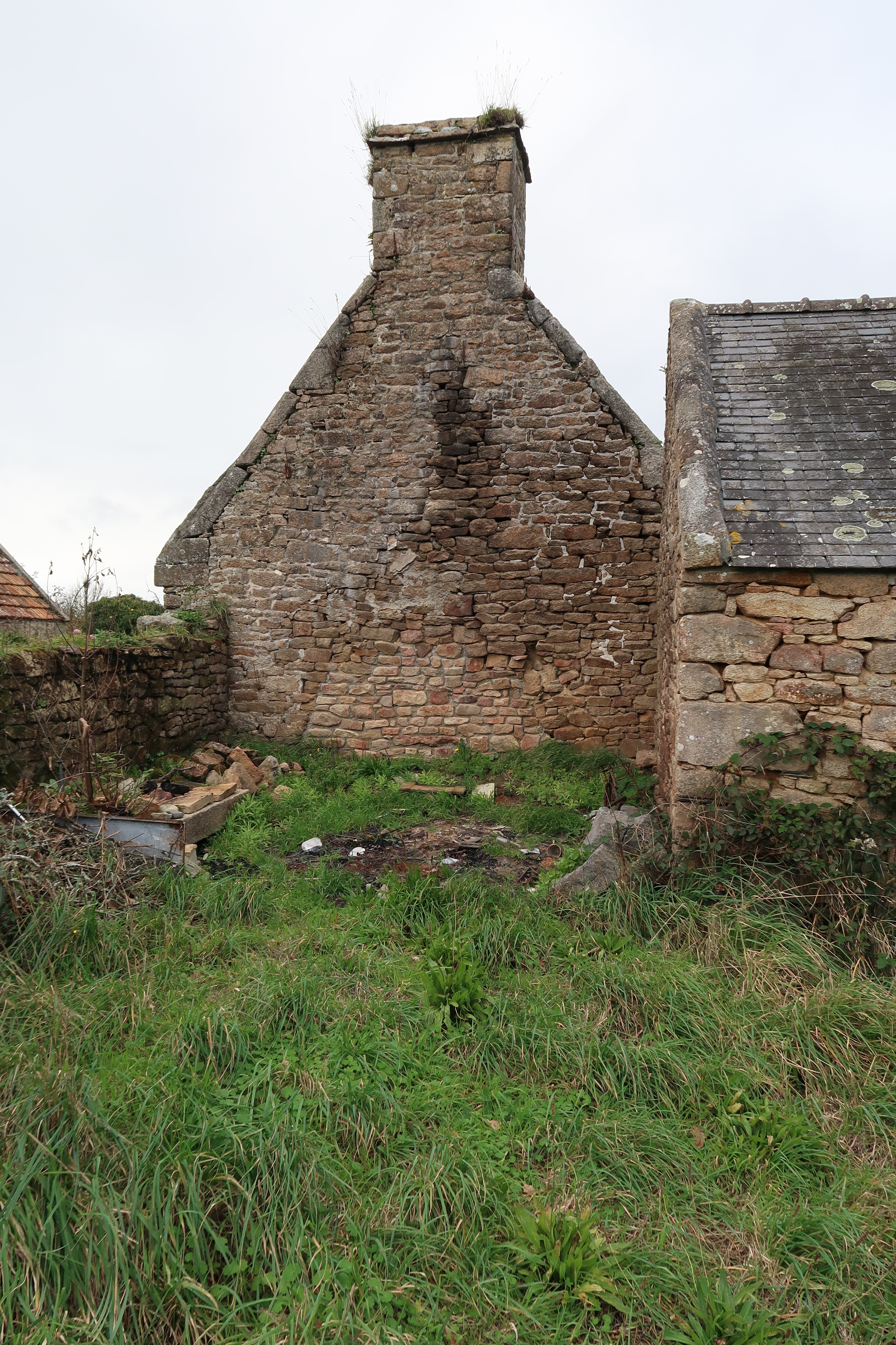 Fournil, pignon oriental (les pierres rougies et la reprise de maçonnerie montrent l'emplacement du four à pain). Les rampants - en place - attestent de la pente originelle du toitImmatriculation