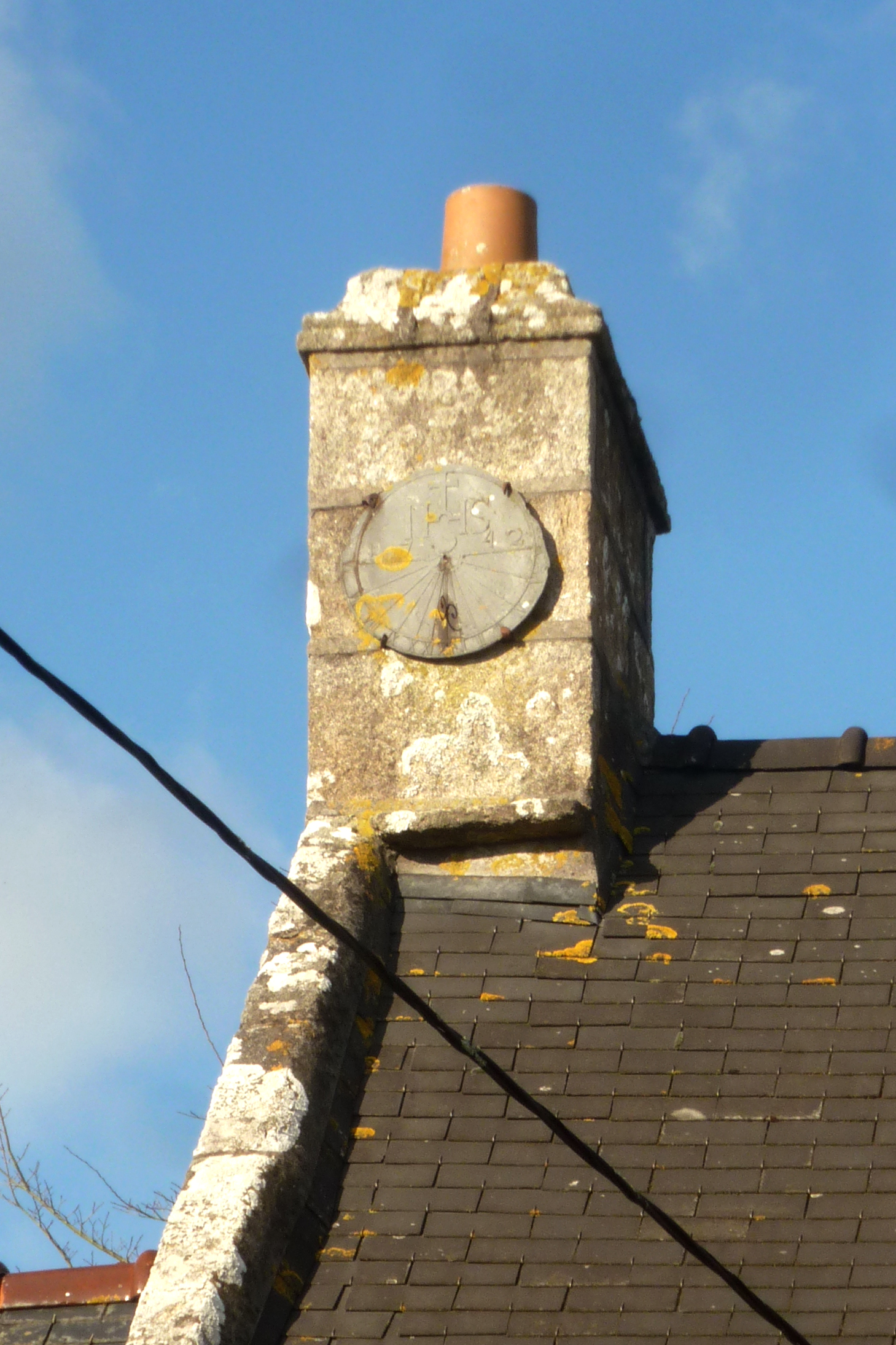 Kerbuzulic, ferme. Détail de la souche de cheminée ouest et cadran solaire daté 1742. (2019)Immatriculation