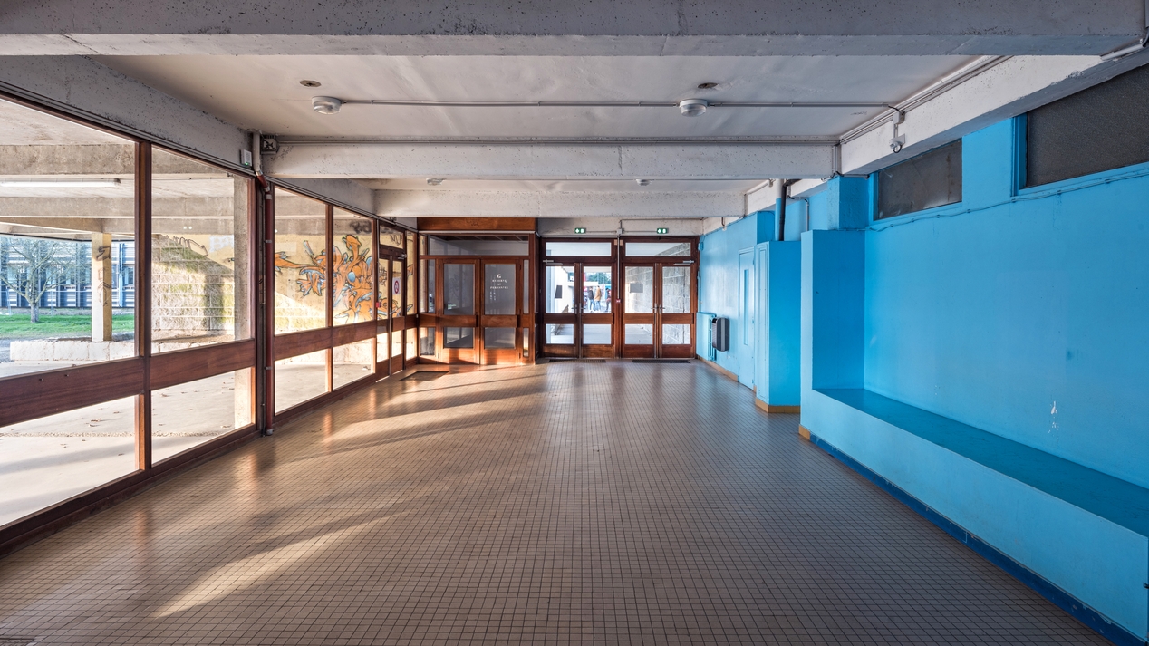 Réfectoire, rez-de-chaussée bas, côté ouest : couloir d'accès aux toilettes, aux escaliers des selfs, vue sur le préau.Immatriculation