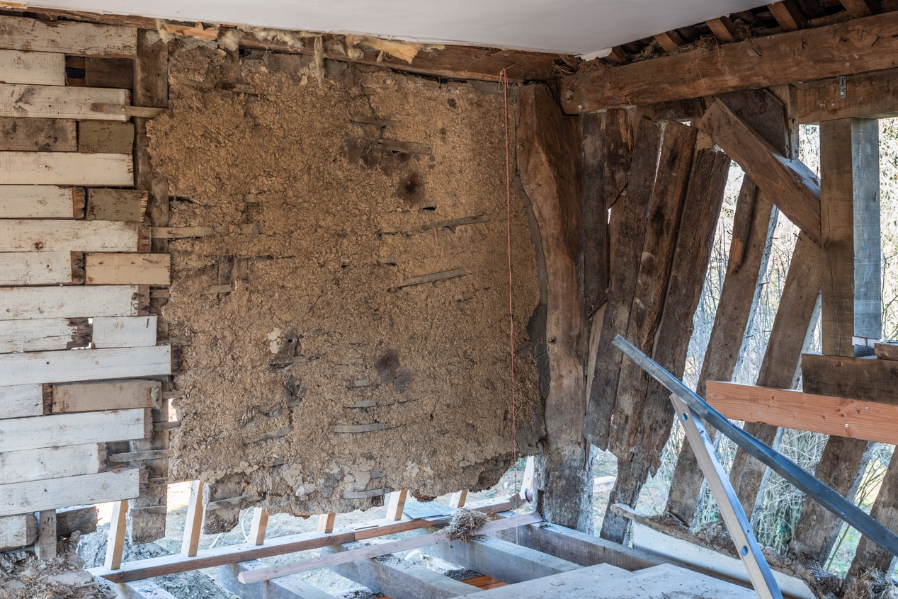 Intérieur de la maison ; vue de l'étage : lattis et remplissage en torchisImmatriculation