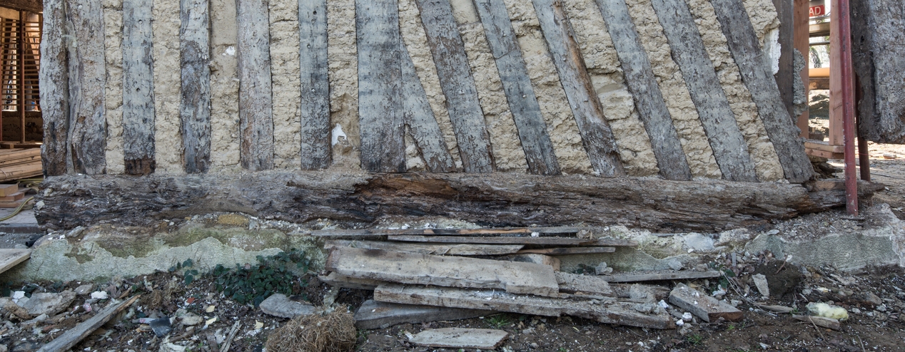 Pan de bois de la façade nord : poteaux verticaux et colombes obliques avec remplissage en torchisImmatriculation