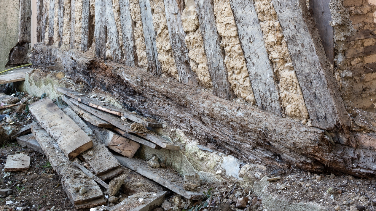 Structure du pan de bois de la façade nord : colombes obliques avec remplissage en torchis et sablière basseImmatriculation