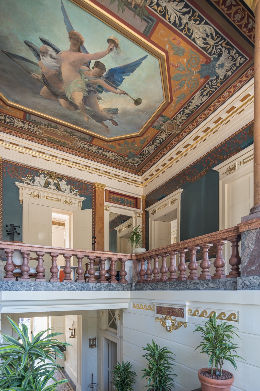 Vestibule haut, vue plafonnante avec l'arrivée de l'escalierImmatriculation
