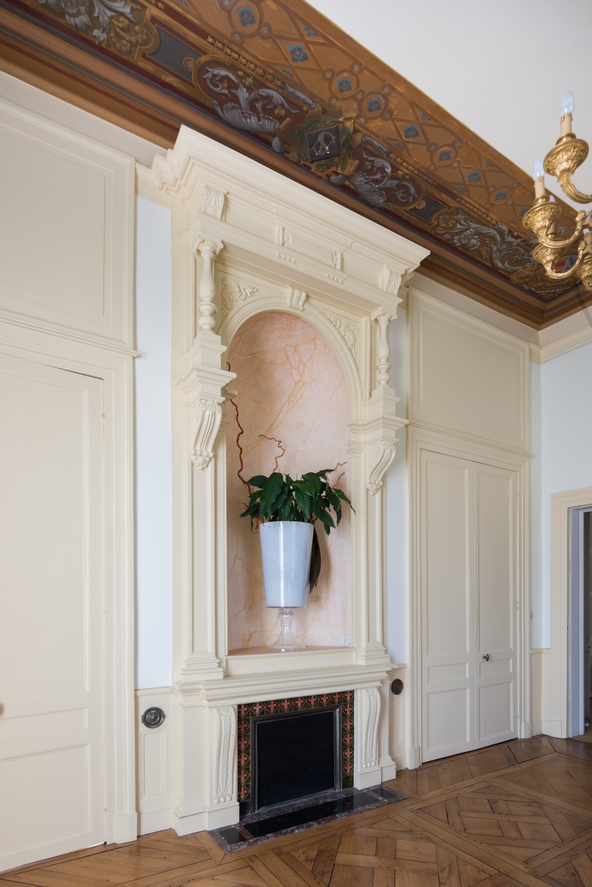 Vue biaise de la cheminée de l'ancienne salle à mangerImmatriculation