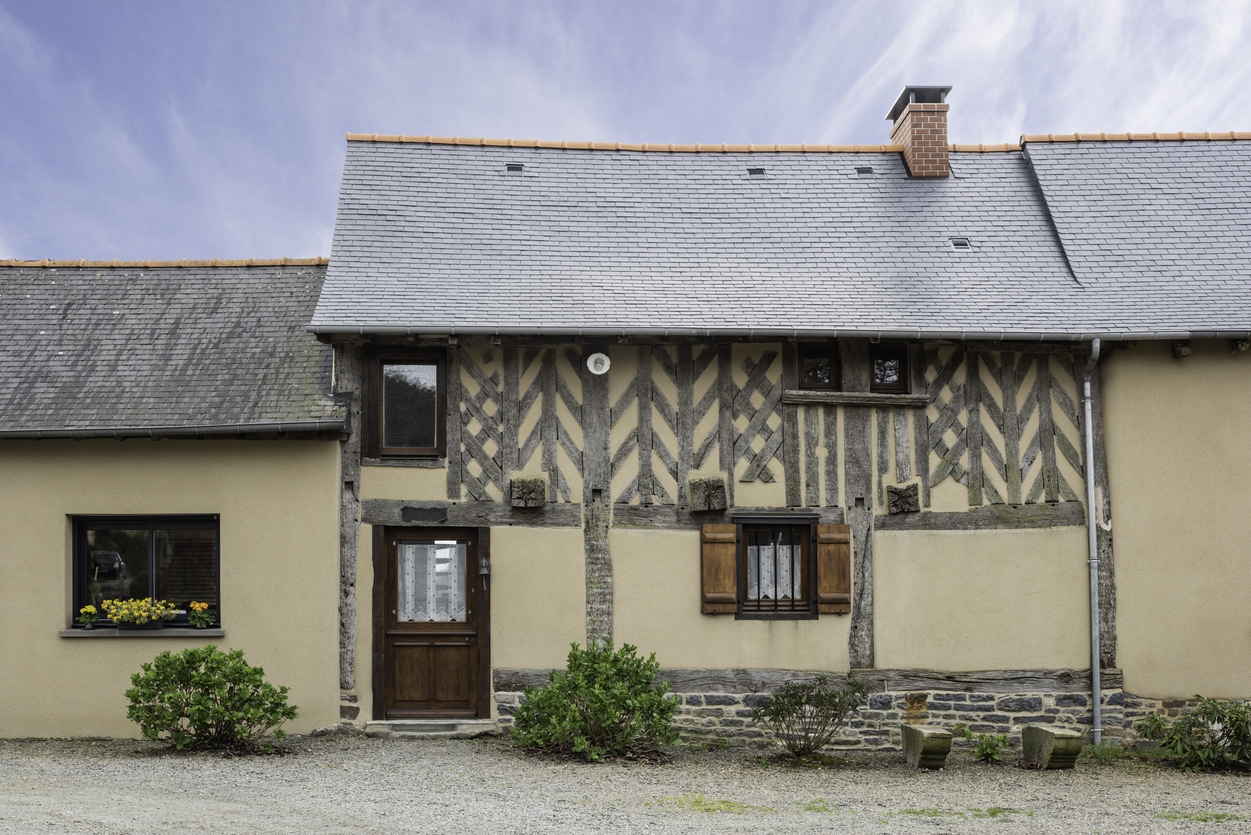 Vue générale de la façade : sorties de poutres (état en 2019)Immatriculation