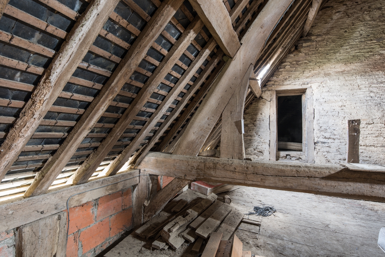 Détail raccord de la charpente et du pan de bois.Immatriculation