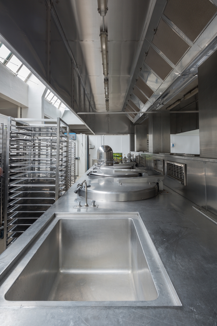 Vue intérieure des cuisines : marmites et évier.