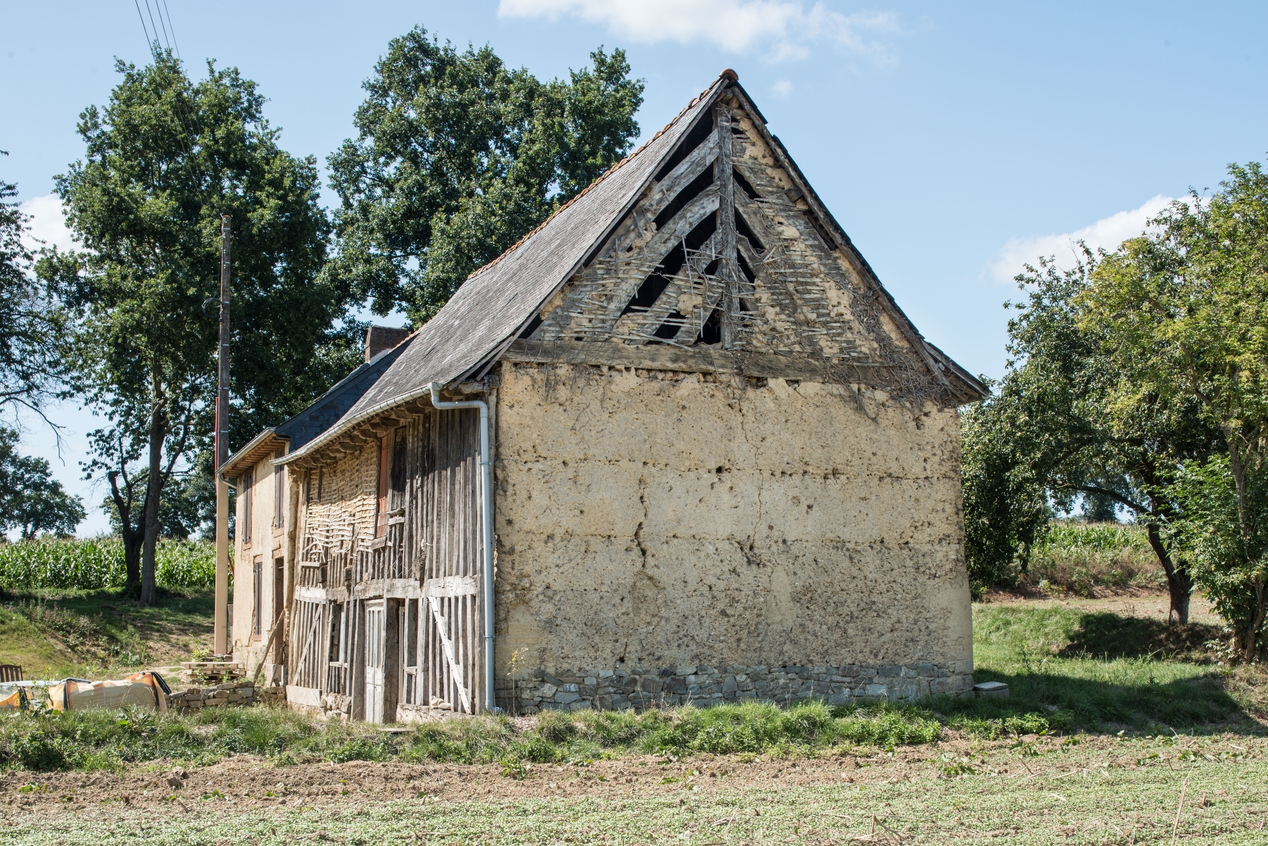 Vue oblique de la façade en pan de bois et du pignon est en mottes de terreImmatriculation