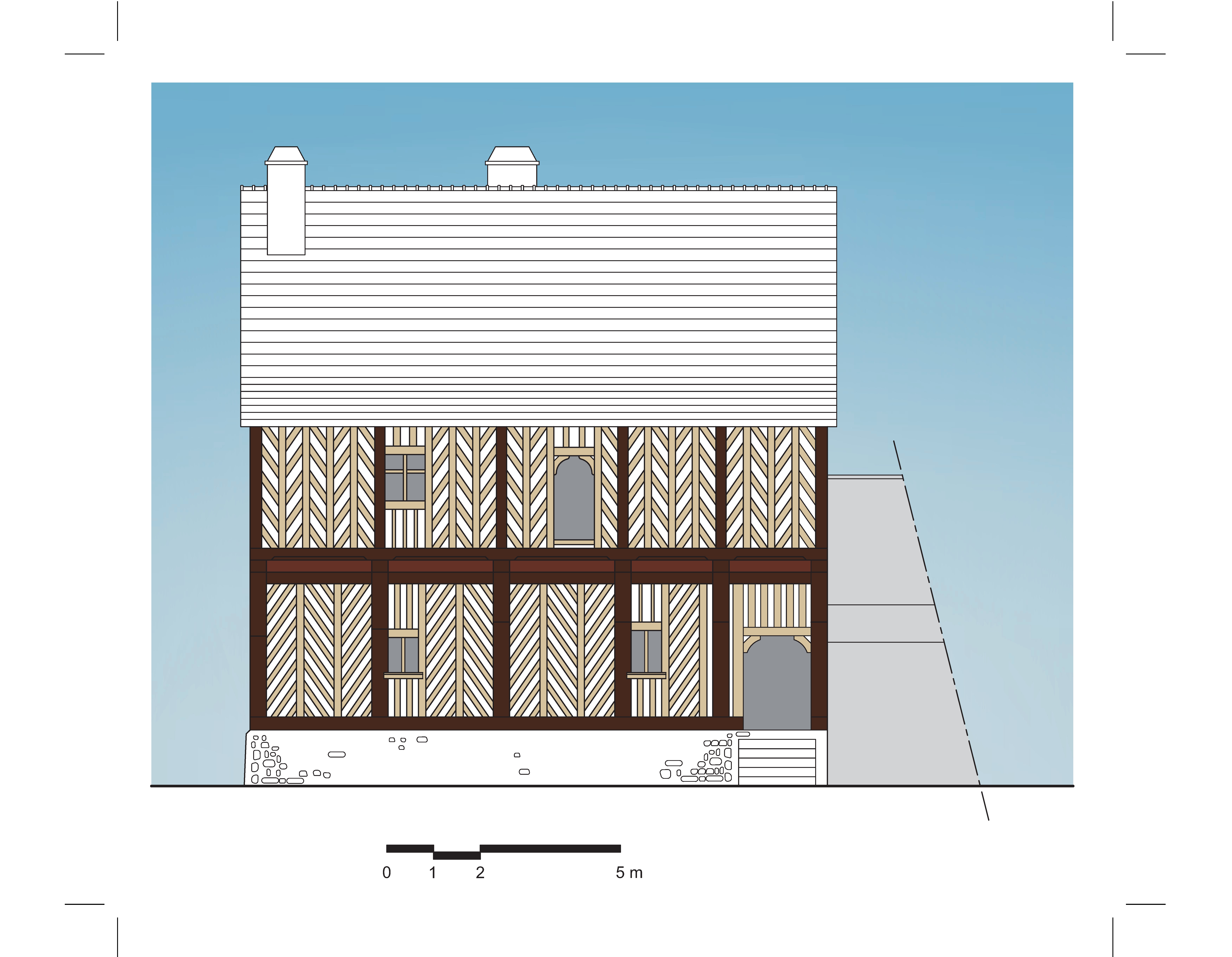 Façade principale, élévation restituant l'état supposé d'origine.Immatriculation