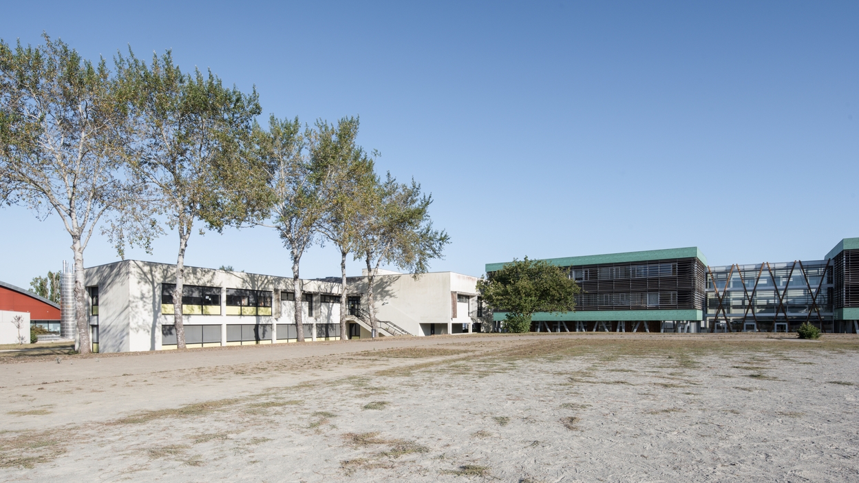 Vue partielle de la façade sud de l'espace sciences (bâtiments B2), Thierry Soquet, architecte, 2015. A gauche, façade est du gymnase.Immatriculation