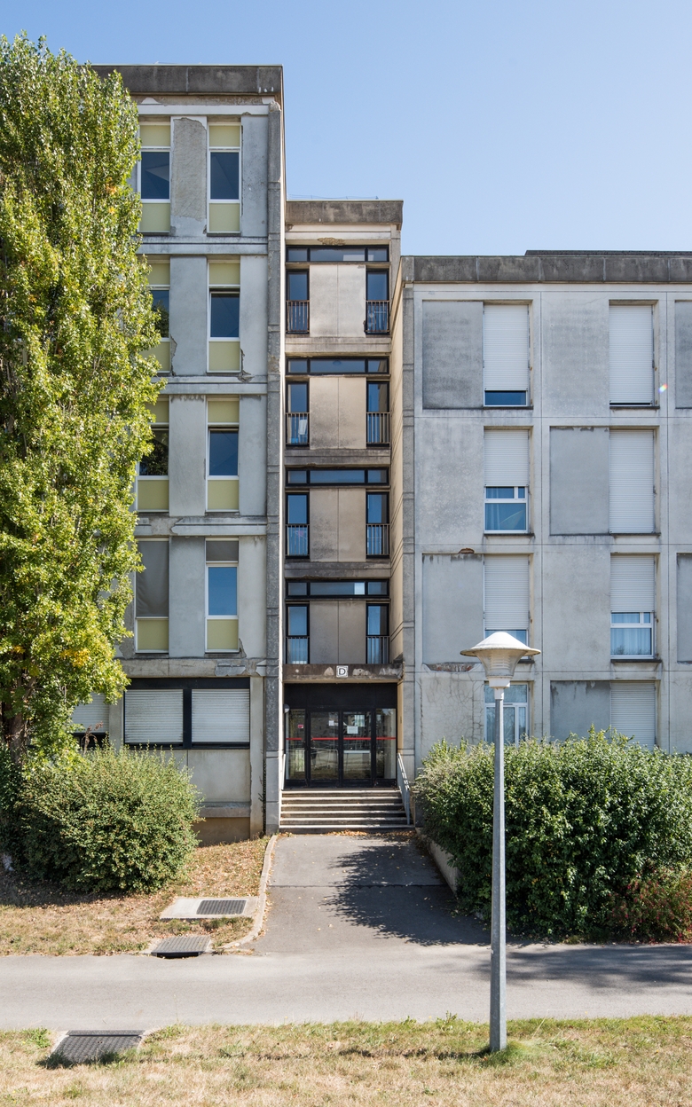 Bâtiment D, façade ouest : cage d'escalier à la jonction entre l'internat de garçons et les logements. Louis Arretche et Jean Lemercier, architectes, 1967.Immatriculation