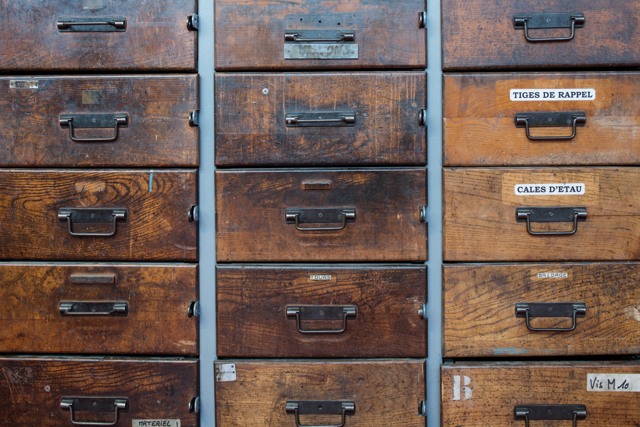 Meuble de rangement à tiroirs dans les ateliers. Détail.Immatriculation