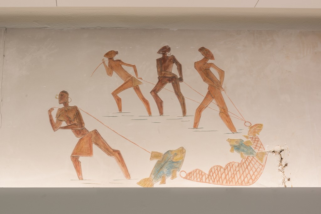 Antoniucci Volti (1915-1989). Frise : en plâtre, gravée et modelée sur le plan de surface polychrome laquée, vers 1957-1958. Détail.Immatriculation