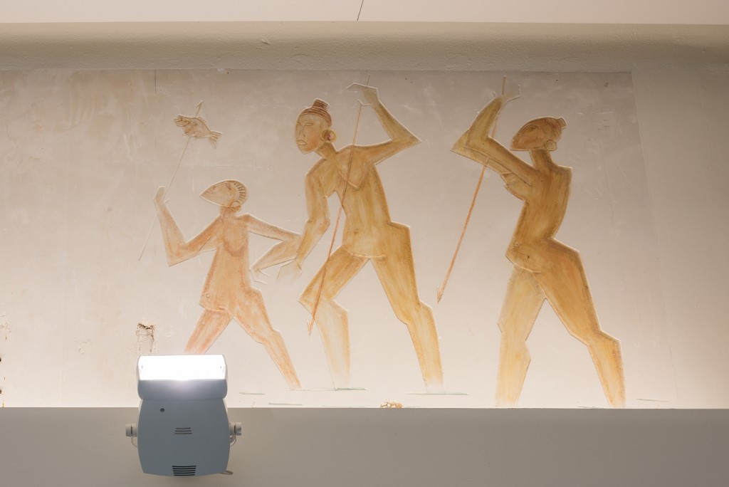 Antoniucci Volti (1915-1989). Frise : en plâtre, gravée et modelée sur le plan de surface polychrome laquée, vers 1957-1958. Détail.Immatriculation