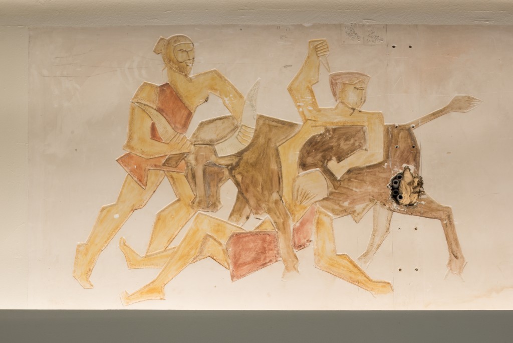 Antoniucci Volti (1915-1989). Frise : en plâtre, gravée et modelée sur le plan de surface polychrome laquée, vers 1957-1958. Détail.Immatriculation