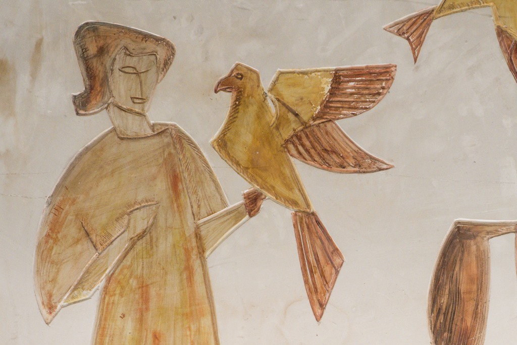 Antoniucci Volti (1915-1989). Frise : en plâtre, gravée et modelée sur le plan de surface polychrome laquée, vers 1957-1958. Détail.Immatriculation
