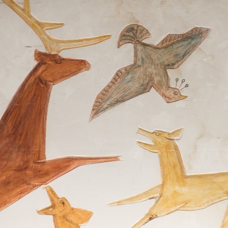 Antoniucci Volti (1915-1989). Frise en plâtre, gravée et modelée sur le plan de surface polychrome laquée, vers 1957-1958. Détail.Immatriculation