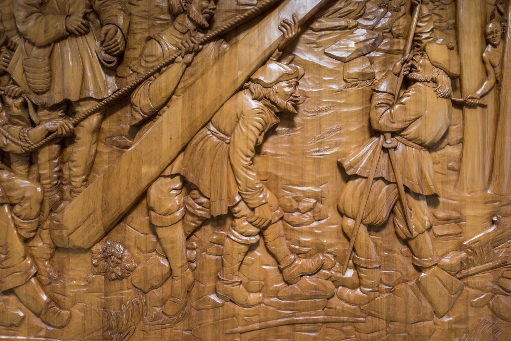 La Croix de Gaspe (1984), sculptée par les sculpteurs de Saint-Jean-Port-Joli en 1984, pour le 450e anniversaire du premier voyage de Jacques Cartier. Détail.Immatriculation