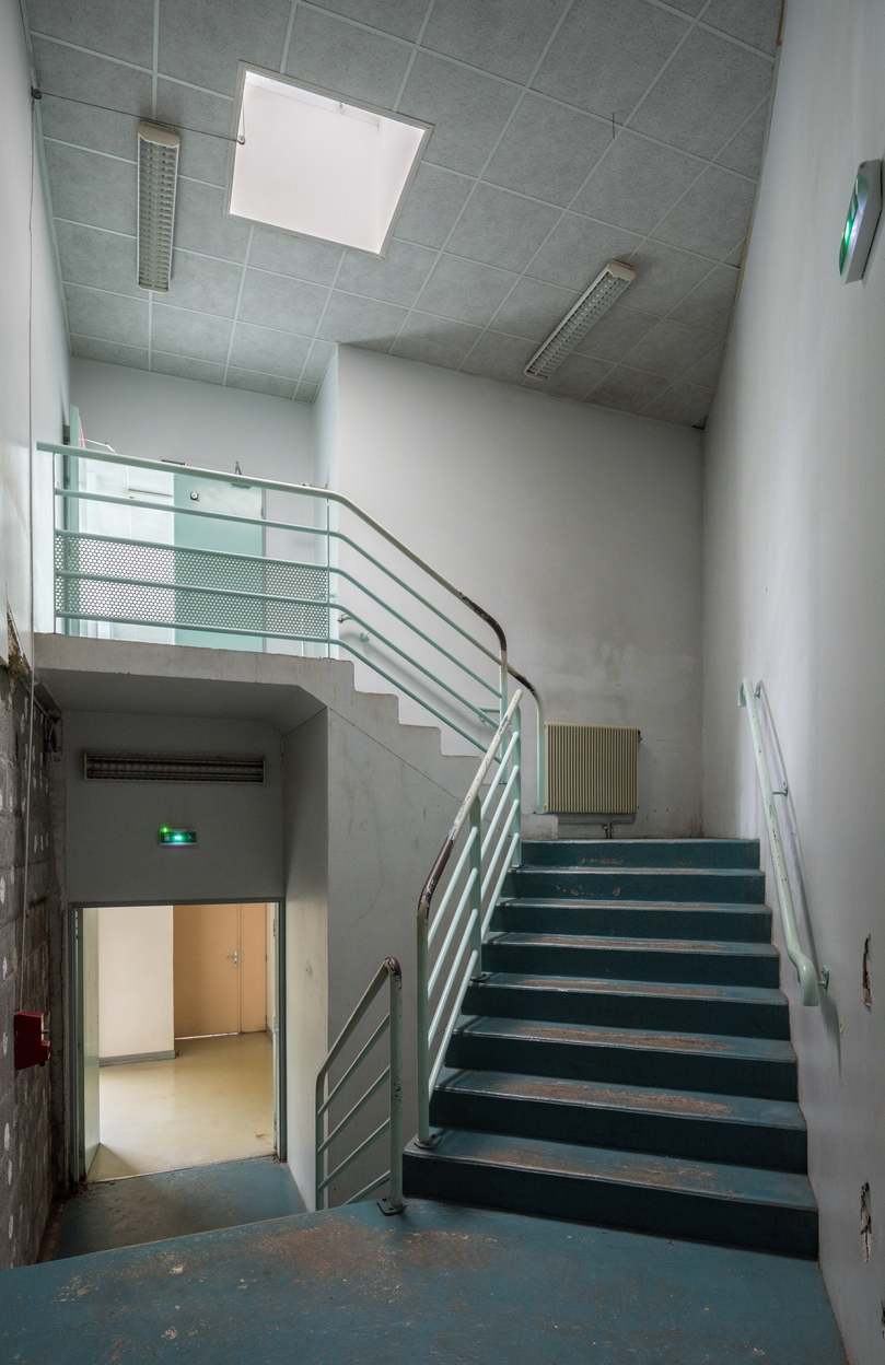 Cage d'escalier dans l'internat à la jonction entre les deux parties. Noter le décalage d'un demi-niveau. Louis Arretche architecte.Immatriculation